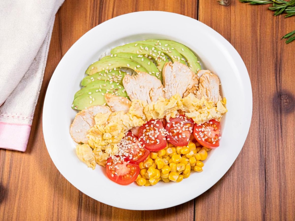 ориз, авокадо, чери домати, сусам, пилешко филе, консервирана царевица, японски омлет 350г
