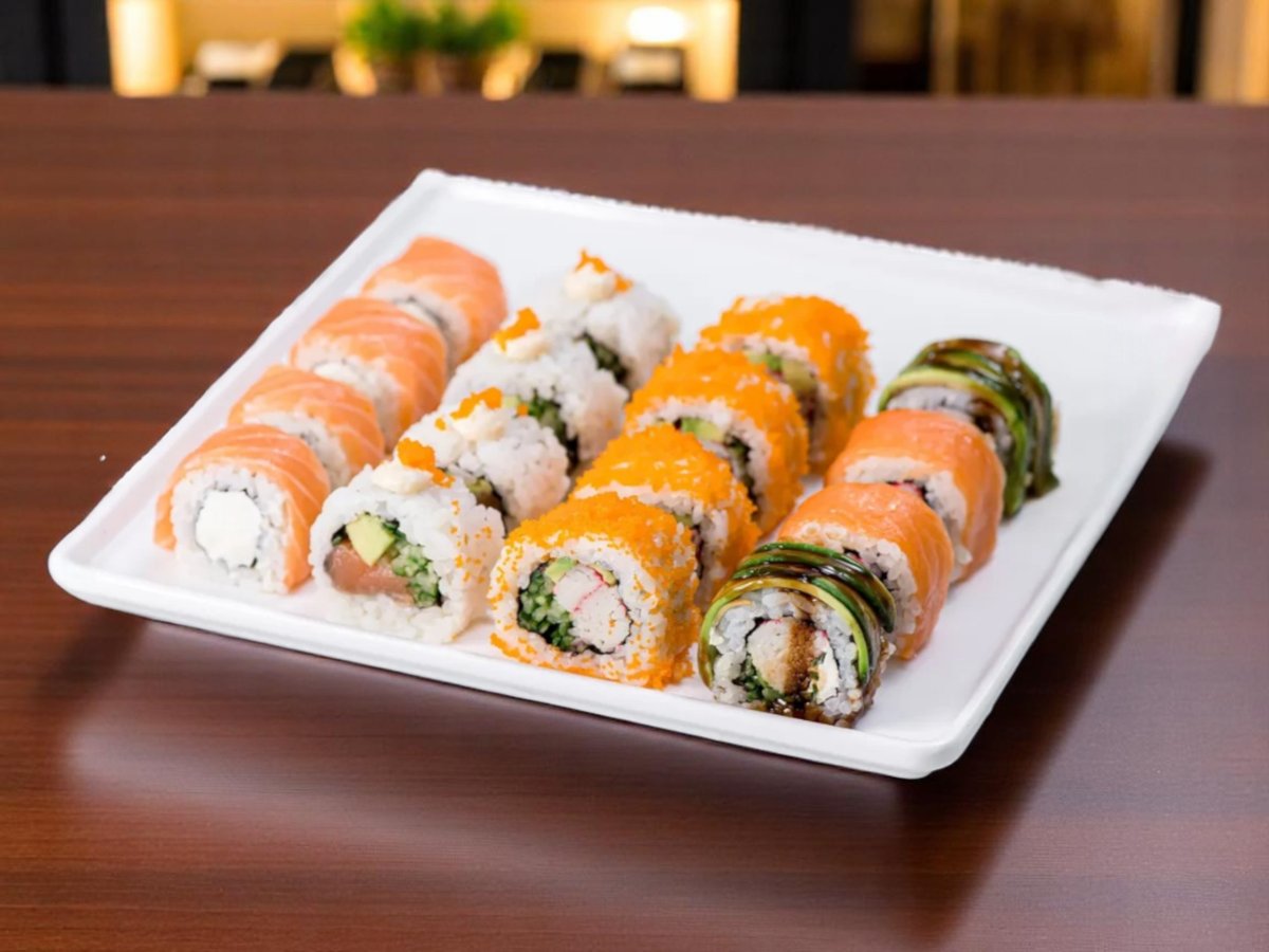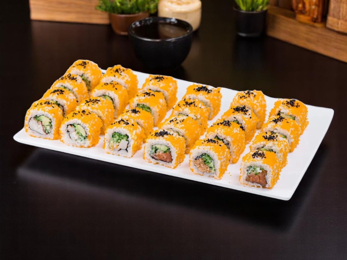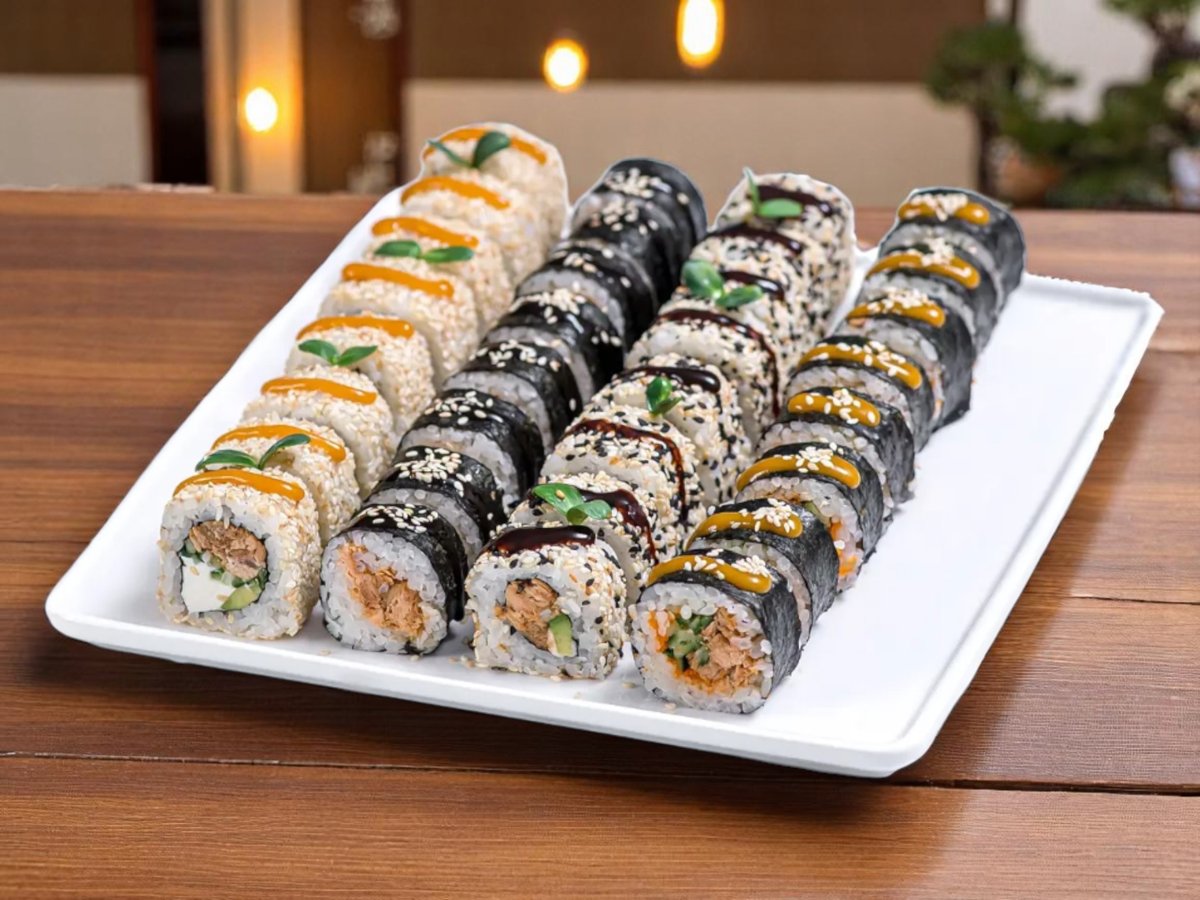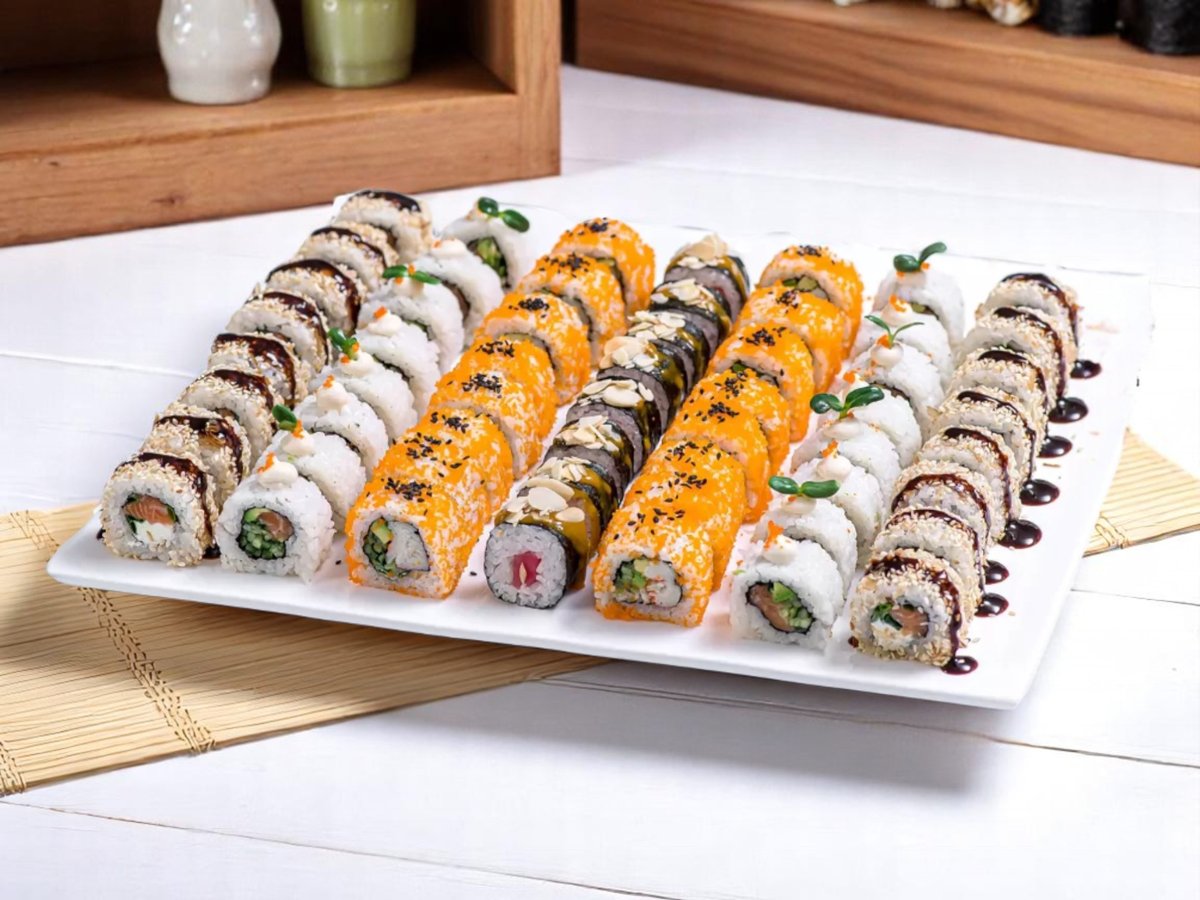 32 броя, изискано съчетание на вкусове и текстури: водорасли нори, ориз, снежен рак, сирене Филаделфия, авокадо, леко осолена сьомга, майонеза, черен сусам, скарида в панировка, масаго, сусам, зелен лук, пържена сьомга, топено сирене, домат, краставица, пикантен сос, омлет, стриден сос, терияки, бадемови стърготини 860г