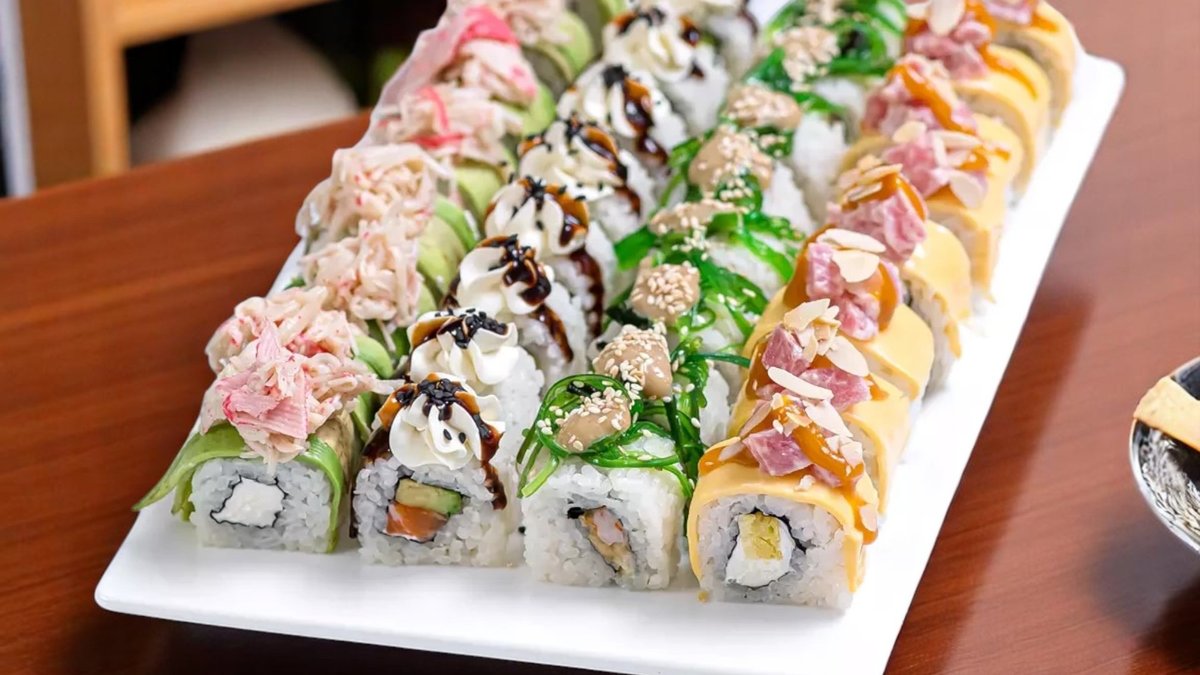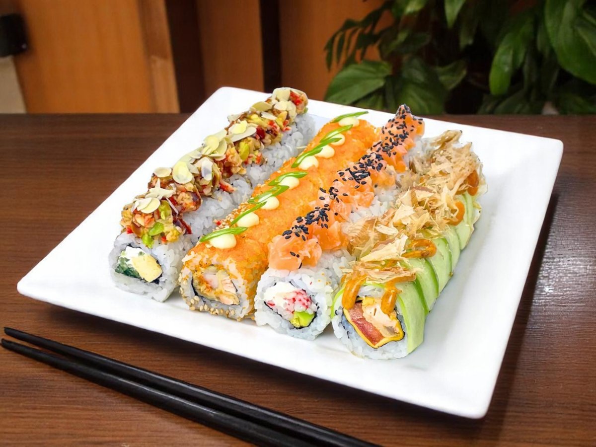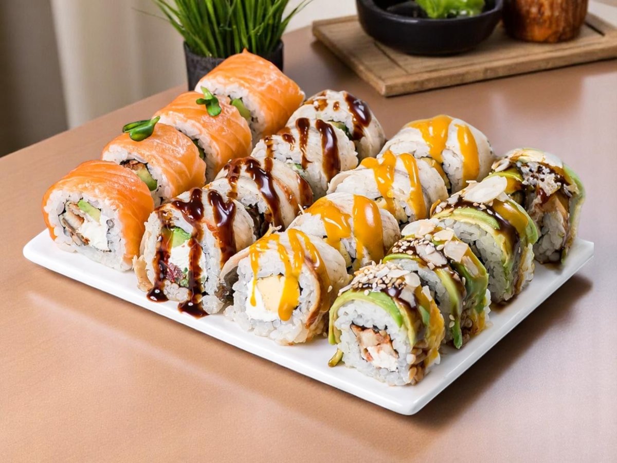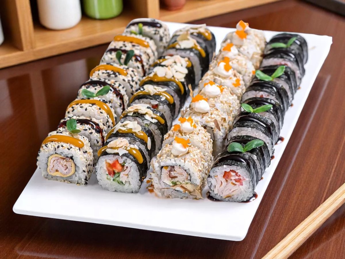 32 броя, изискано съчетание на вкусове и текстури: водорасли нори, ориз, снежен рак, сирене Филаделфия, авокадо, леко осолена сьомга, майонеза, черен сусам, скарида в панировка, масаго, сусам, зелен лук, пържена сьомга, топено сирене, домат, краставица, пикантен сос, омлет, стриден сос, терияки, бадемови стърготини 860г