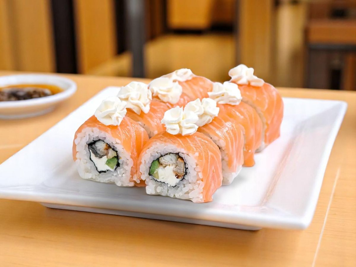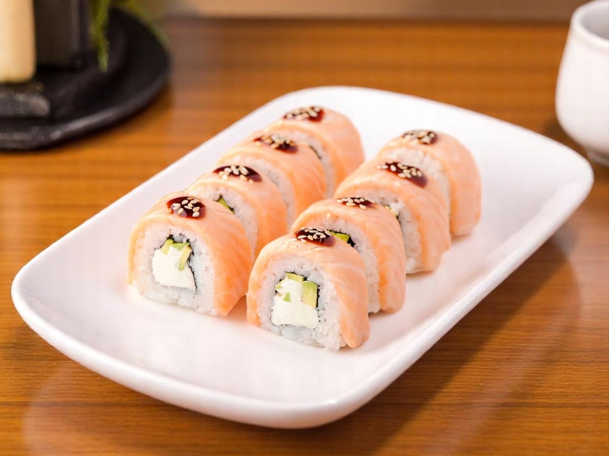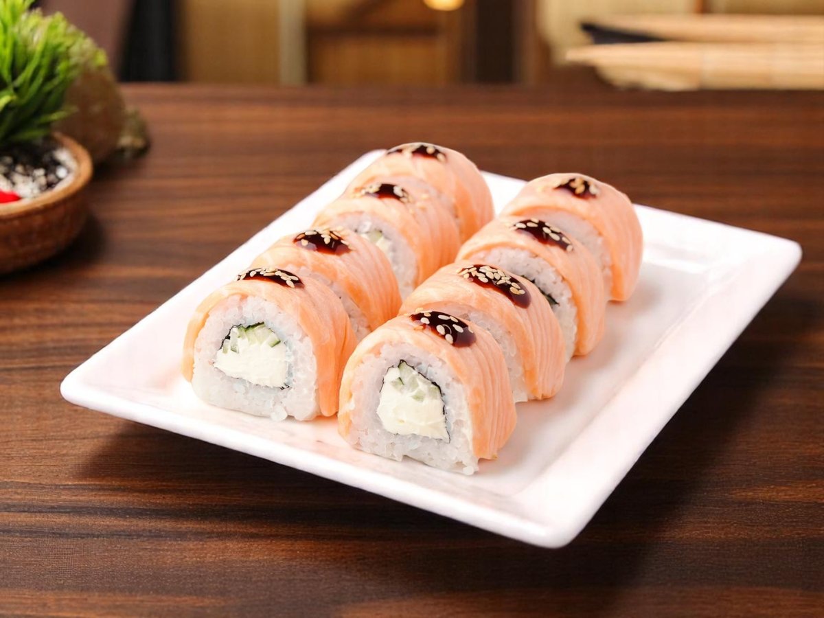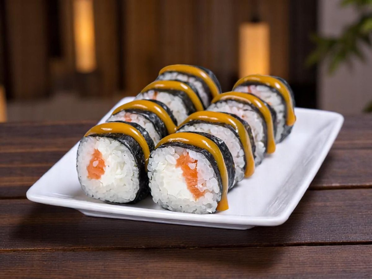 8 броя, ориз, нори, пържена сьомга, сирене Филаделфия, aвокадo, сусам, сос от манго 180г