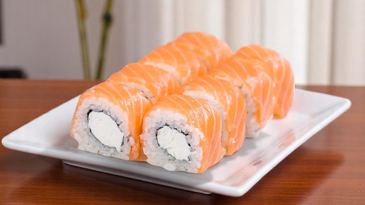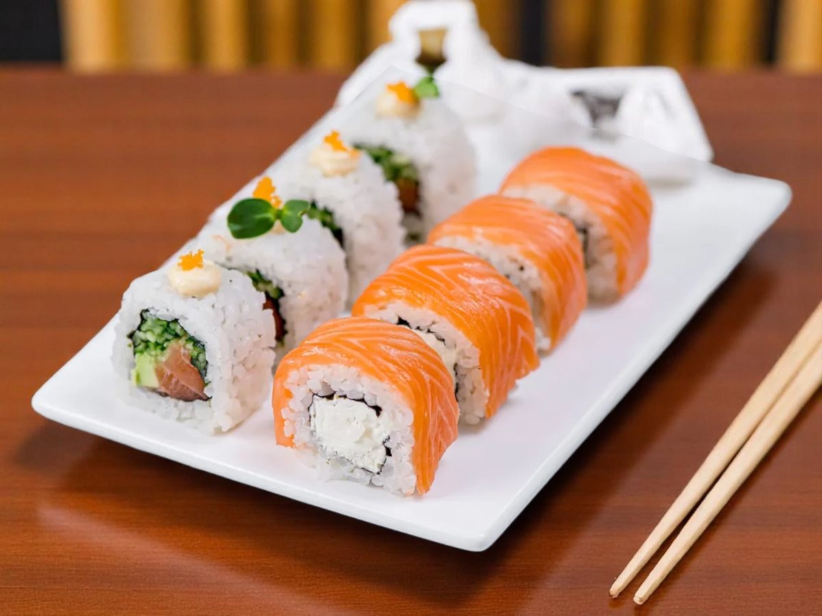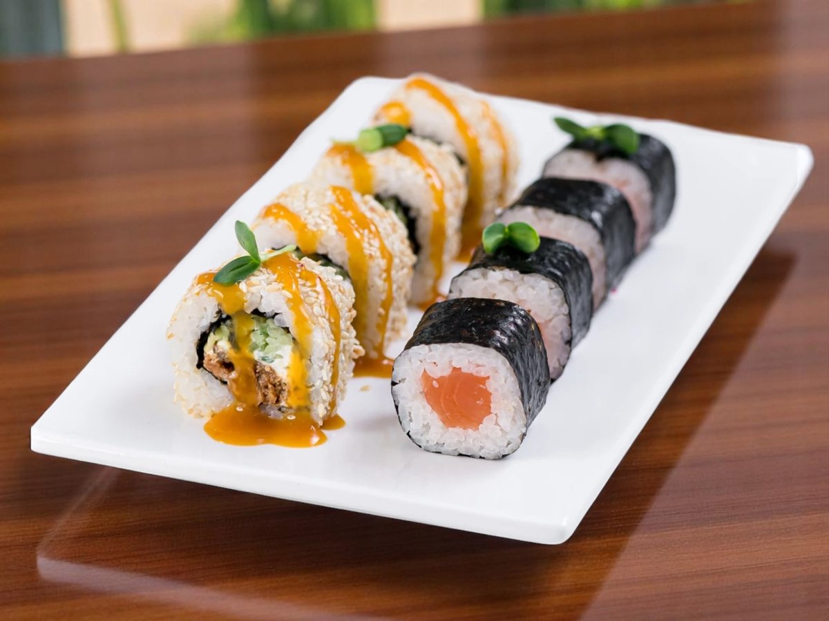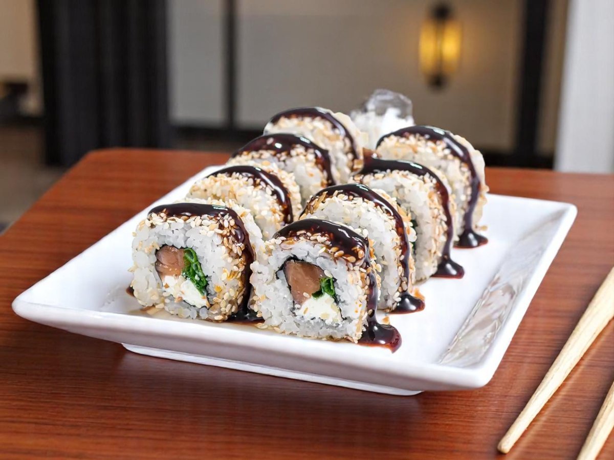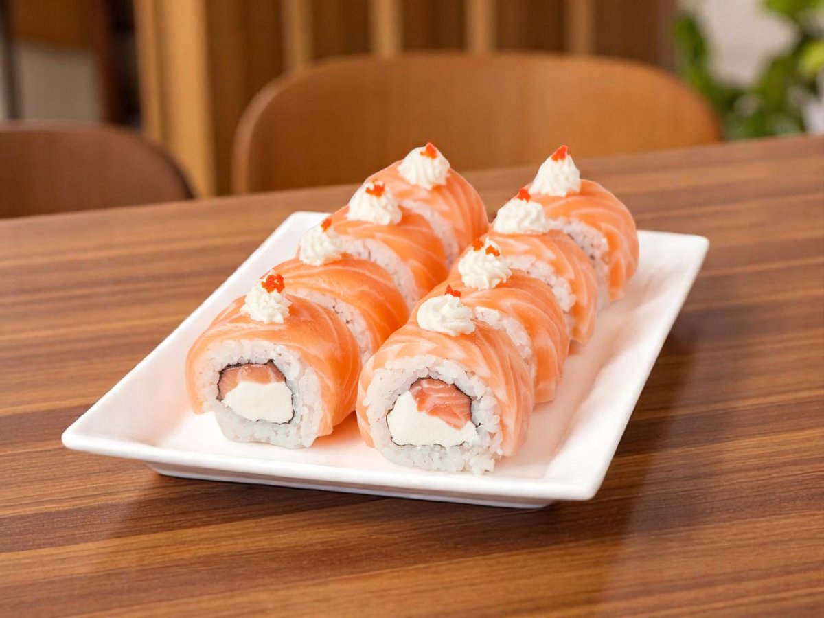8 броя, ориз, нори, пържена сьомга, сирене Филаделфия, aвокадo, сусам, сос от манго 180г