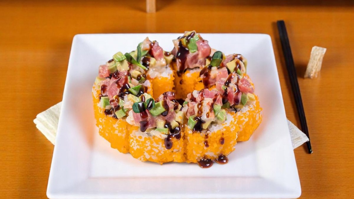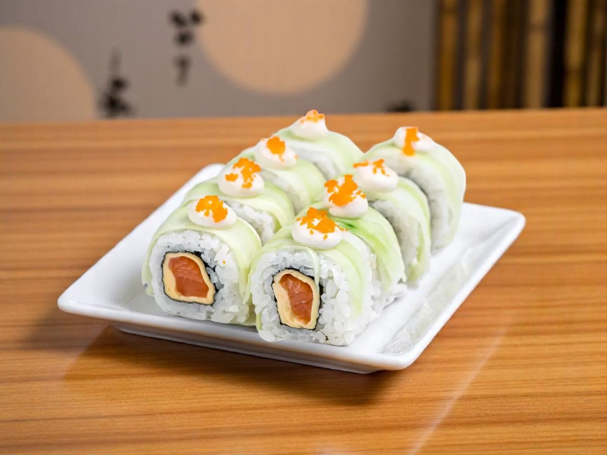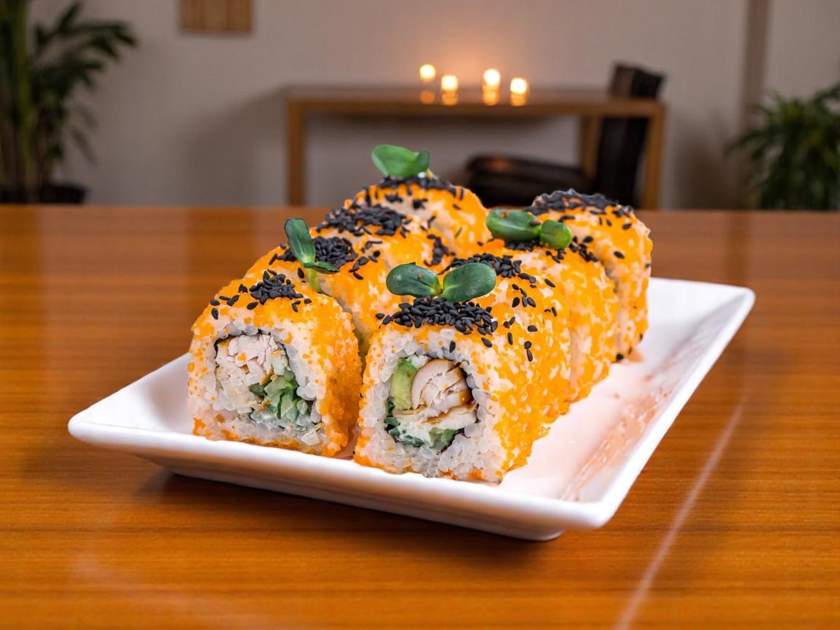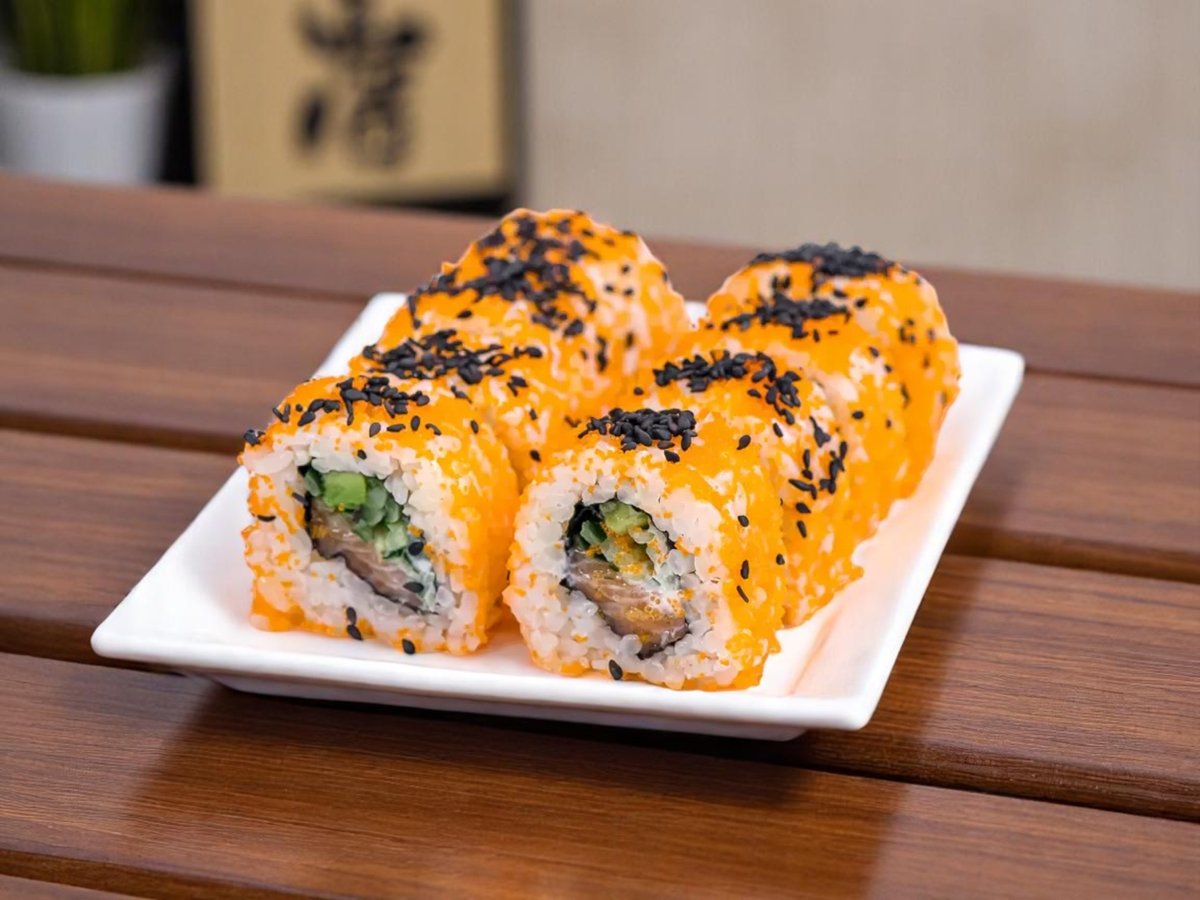 8 броя, крехко печено руло с капаче от змиорка, краставица и авокадо, гарнирано с червен хайвер масаго 240г