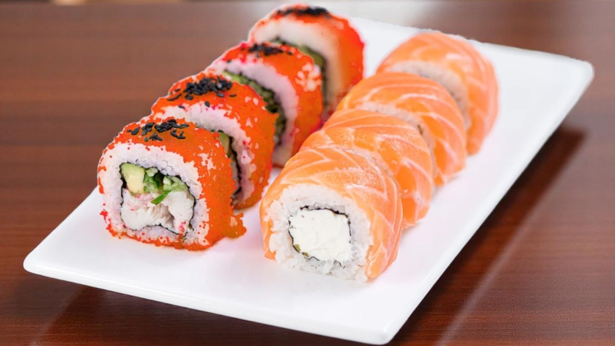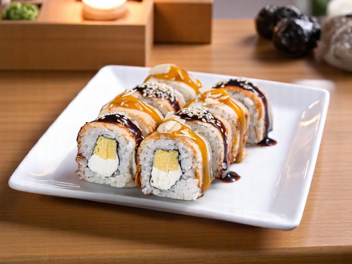 8 броя, ориз, нори, тигрови скариди, сирене Филаделфия, панировка, хайвер тобико, японски омлет 280г