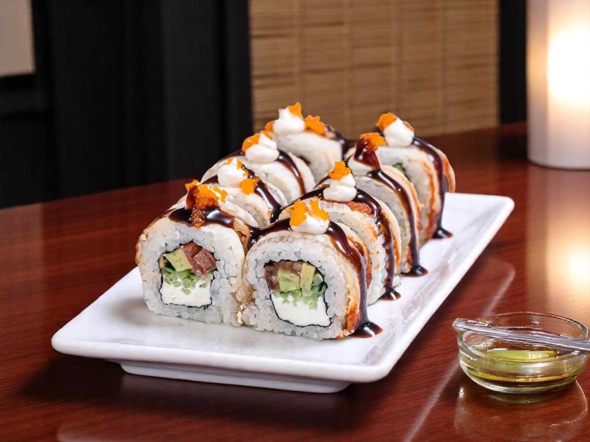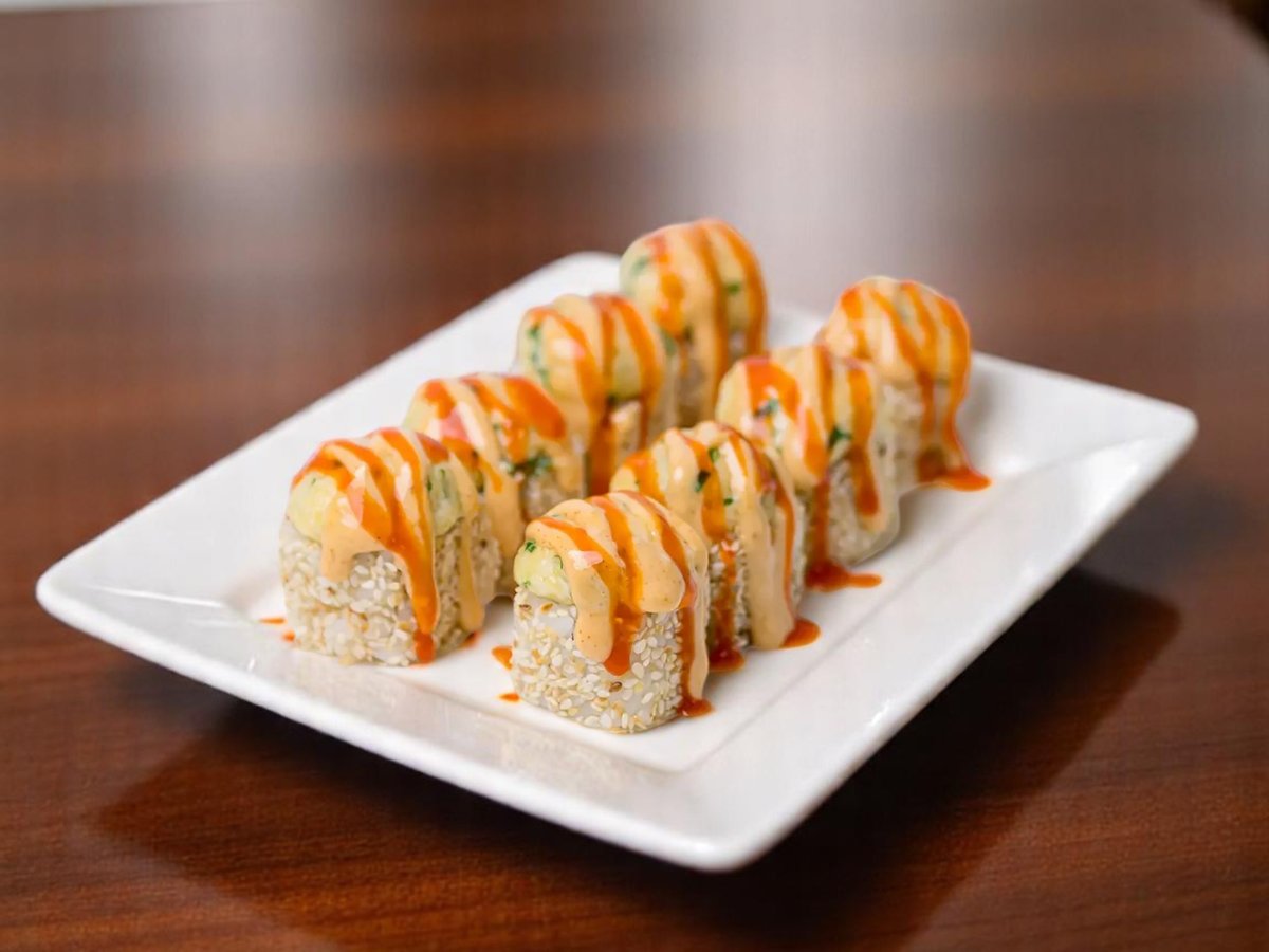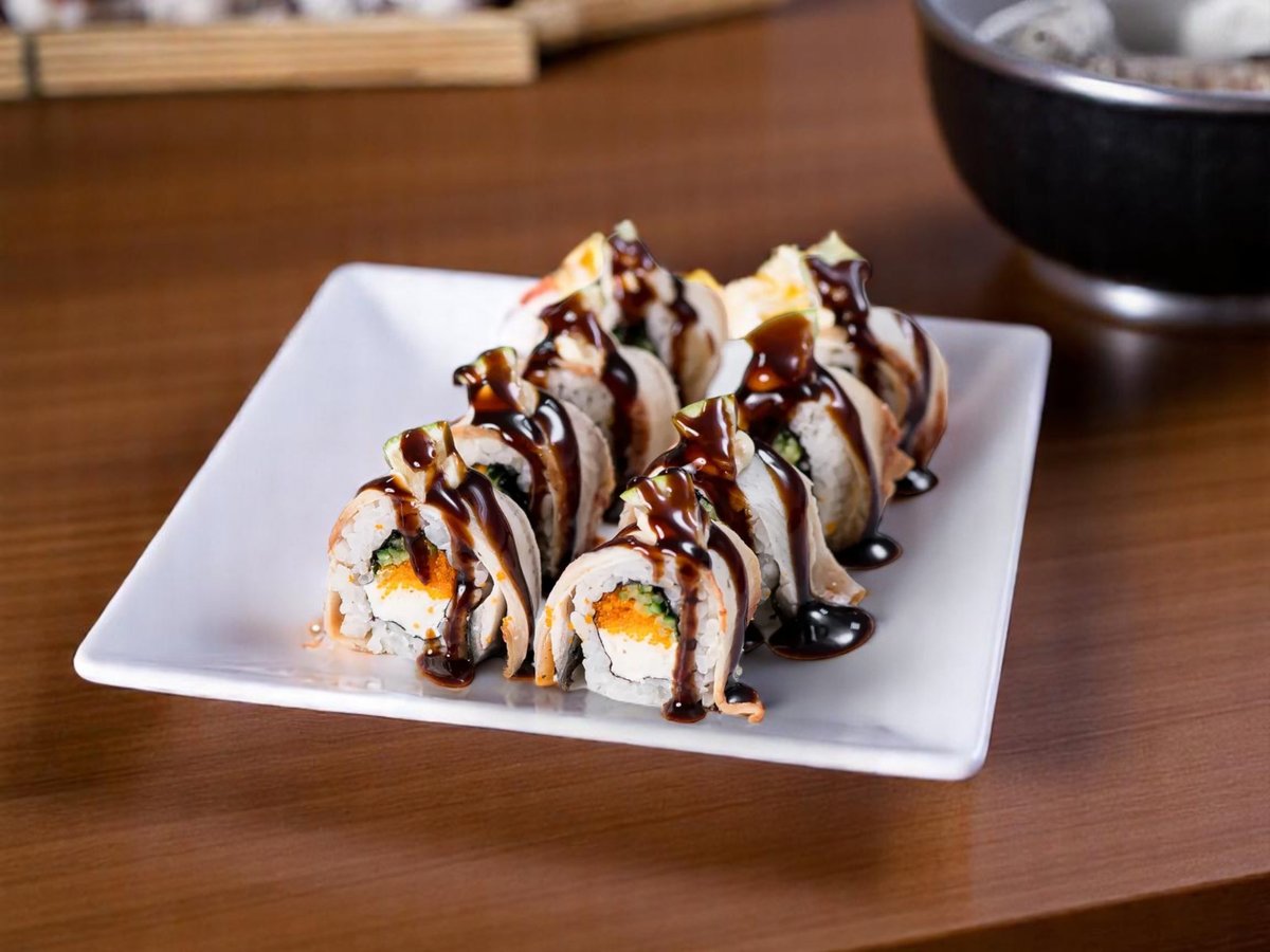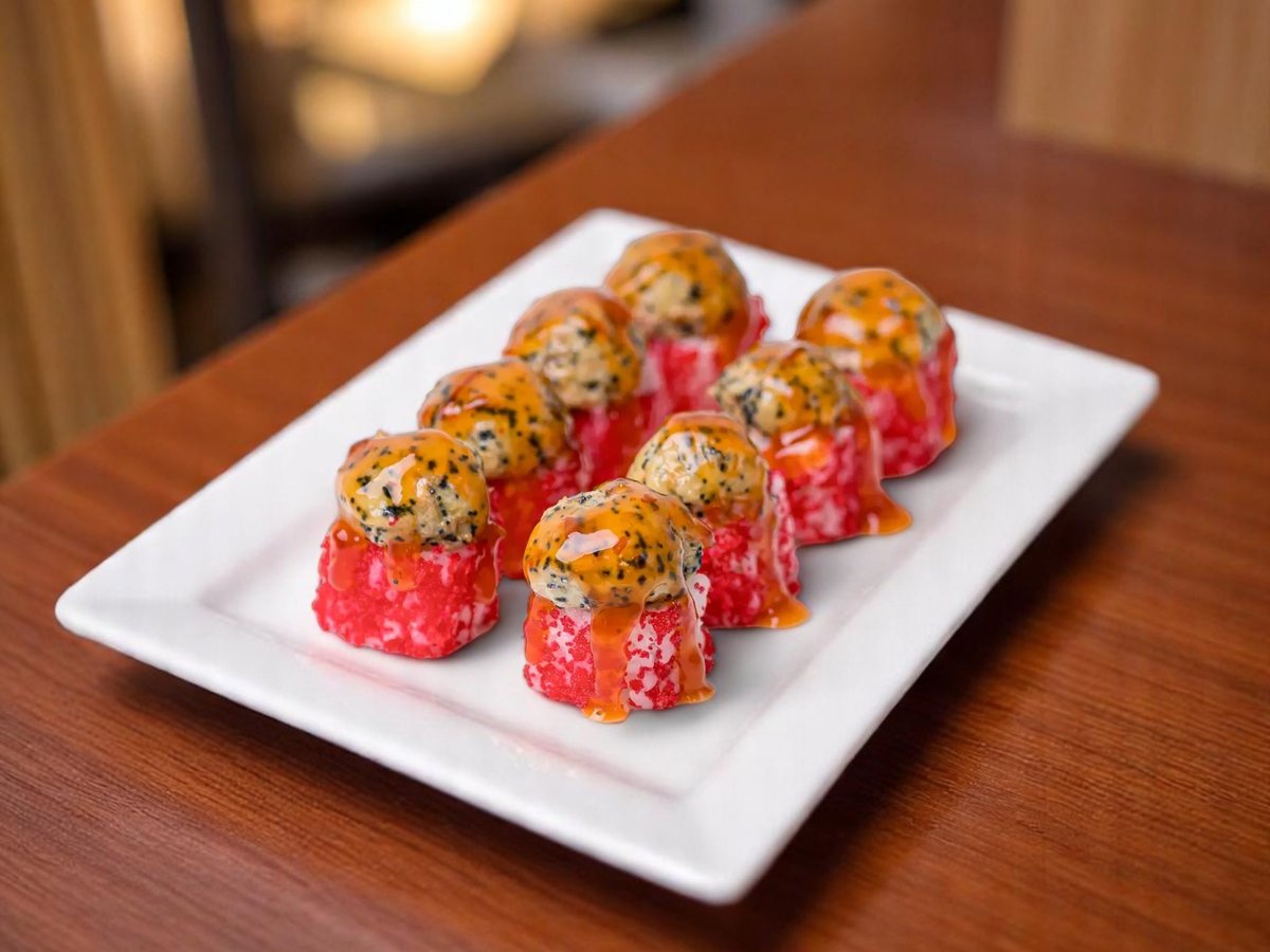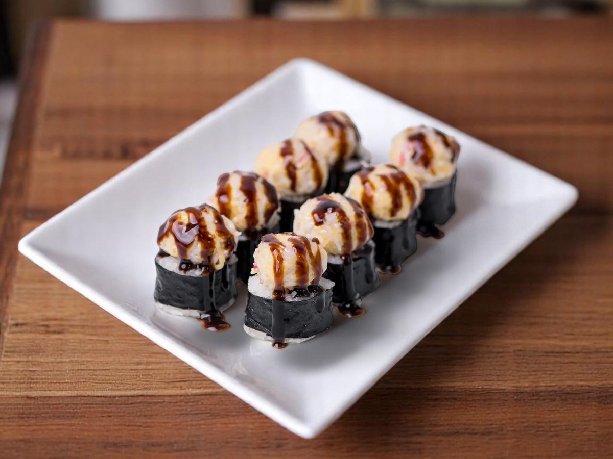 8 броя, уникално руло с панирани скариди, динамит сос, топено сирене и гарнирано с хрупкав лук и сос терияки 220г