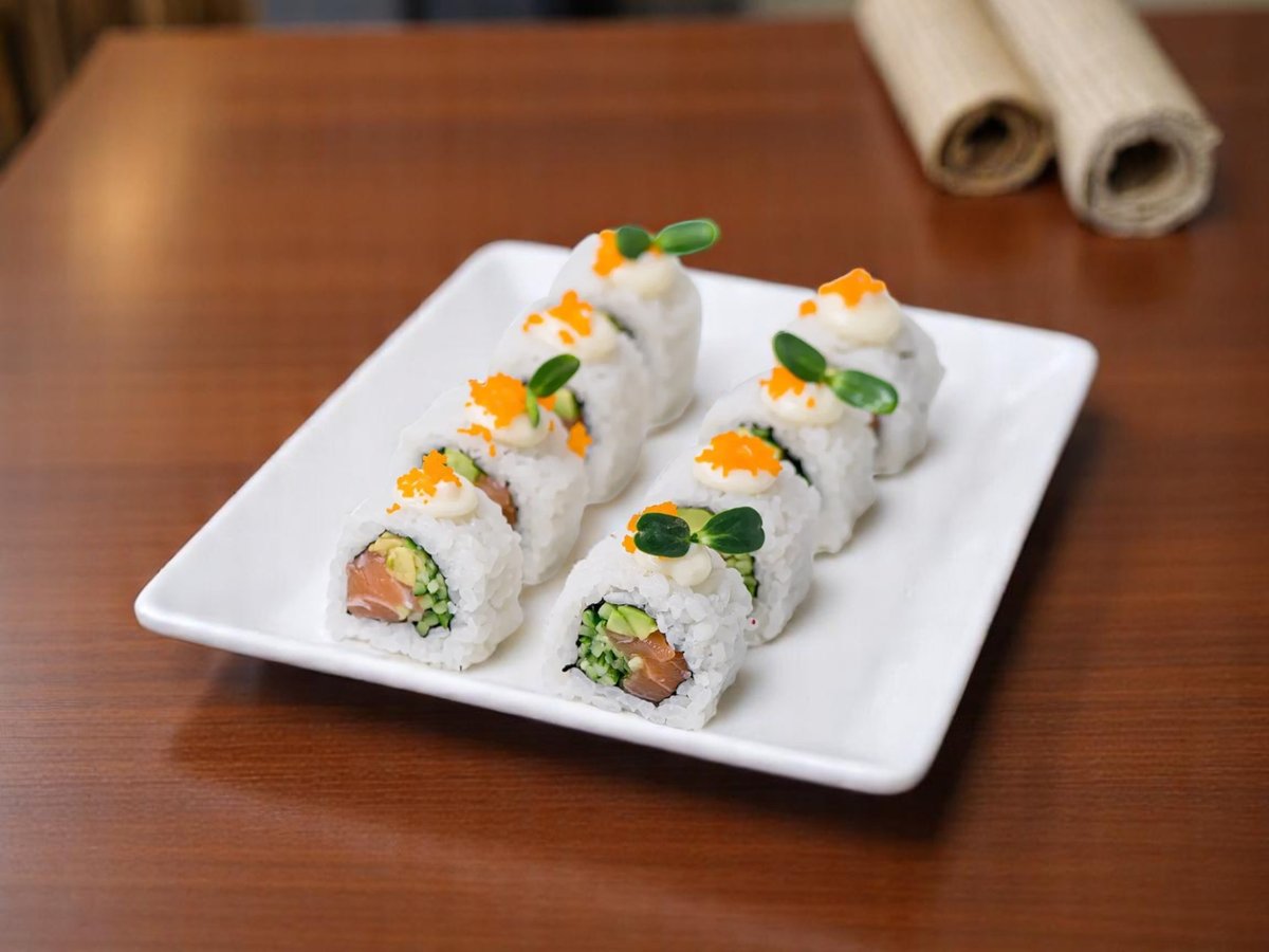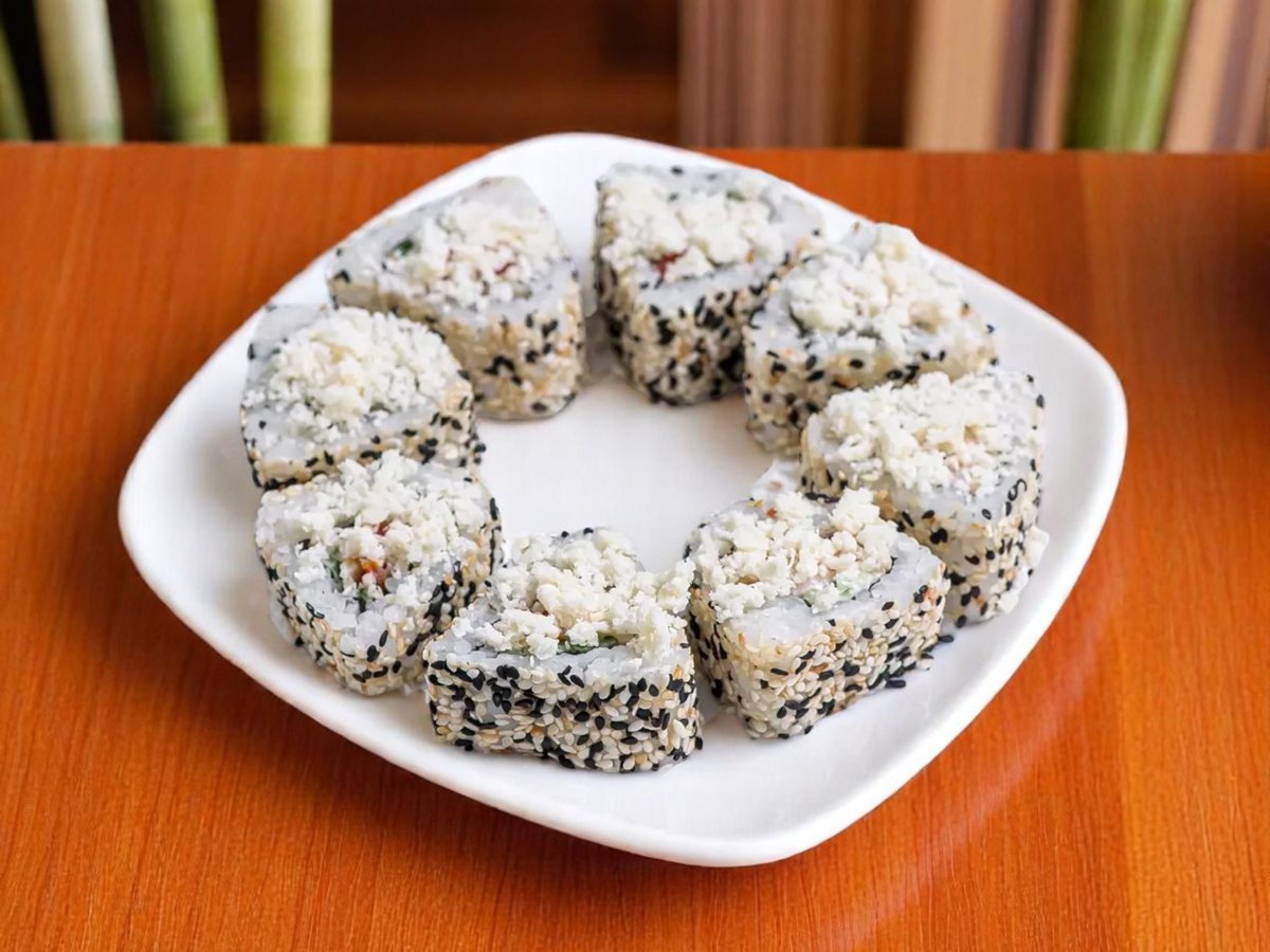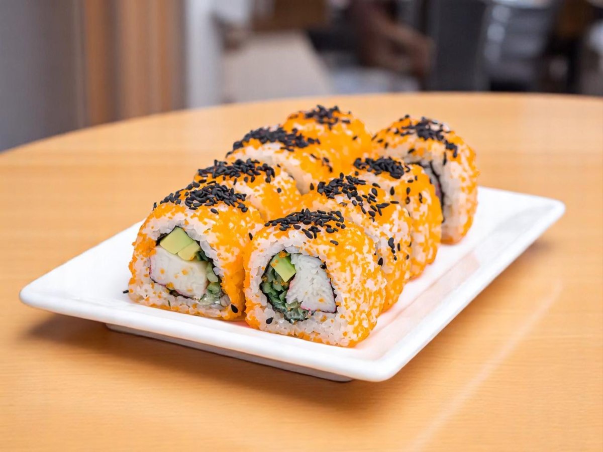 8 броя, ориз, нори, прясна краставица, японска майонеза, снежен рак, масаго хайвер, авокадо, черен сусам 200г