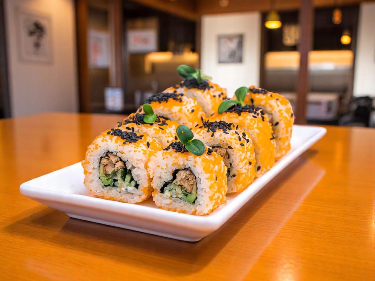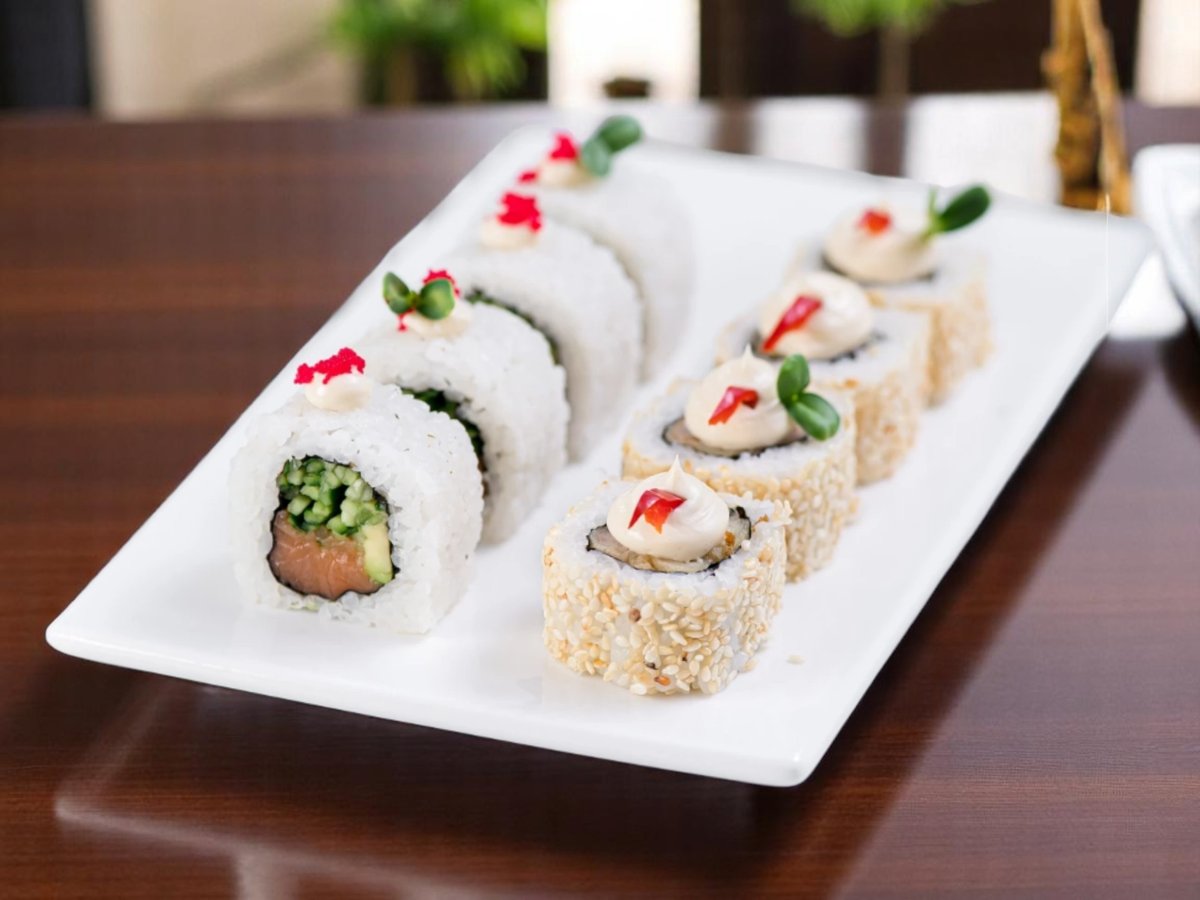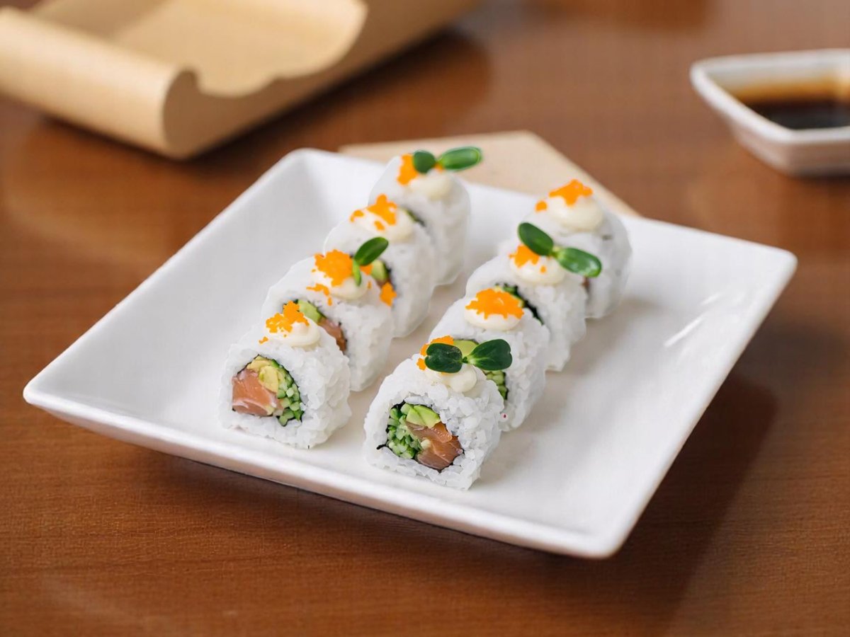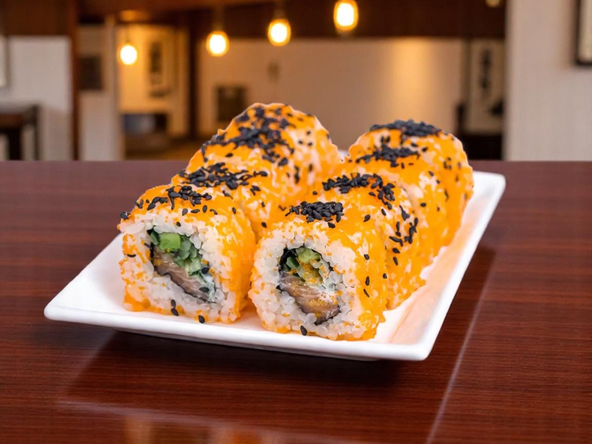 8 броя, ориз, нори, прясна краставица, японска майонеза, снежен рак, масаго хайвер, авокадо, черен сусам 200г
