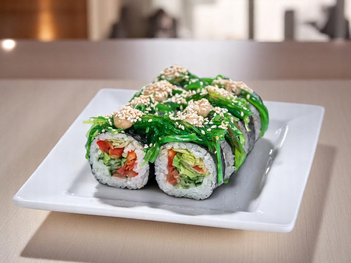 ориз, авокадо, прясна краставица, соеви кълнове, вакаме, сусам, сос по наша специална рецепта 350г