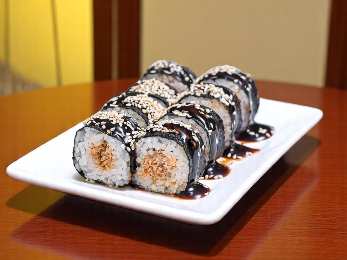 8 броя, ориз, нори, сьомга, сусам, зелен лук, фета сирене, къстчета риба тон, сос терияки 170г