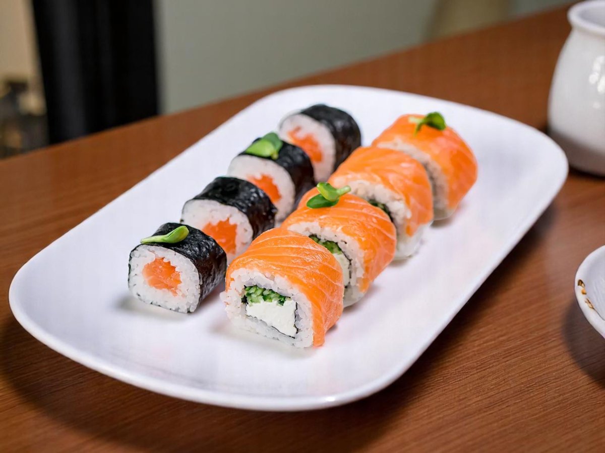 8 броя, ориз, нори, пържена сьомга, сирене Филаделфия, топено сирене, хайвер масаго, японски омлет томаго 200г