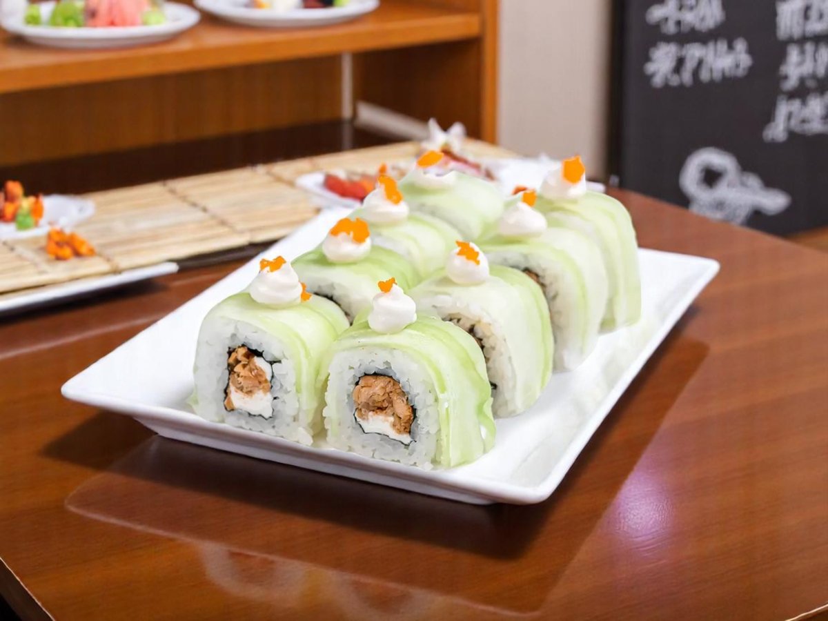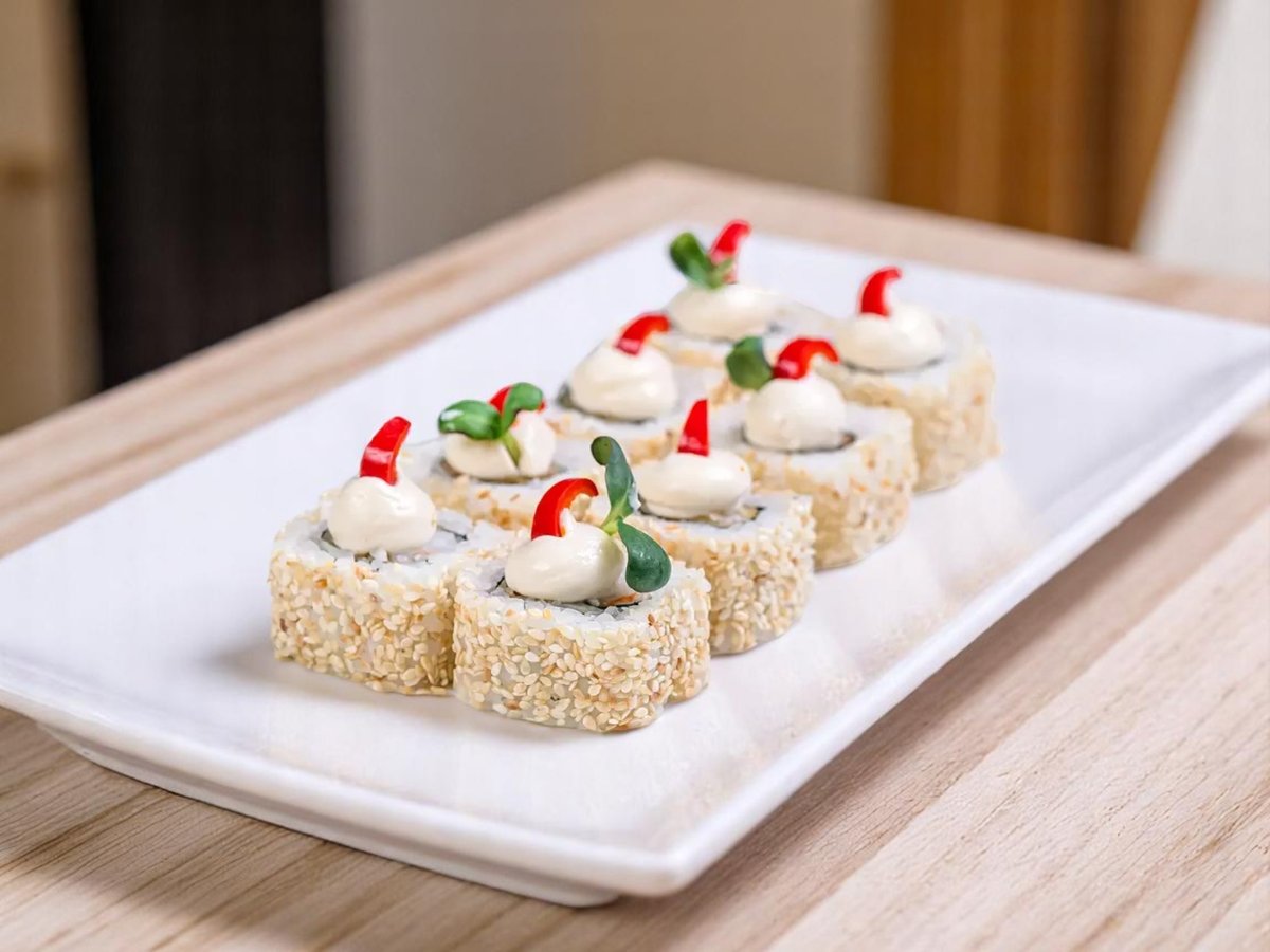 8 броя, ориз, нори, прясна краставица, сирене Филаделфия, панировка, хайвер тобико, снежен рак, твърдо сирене 280г