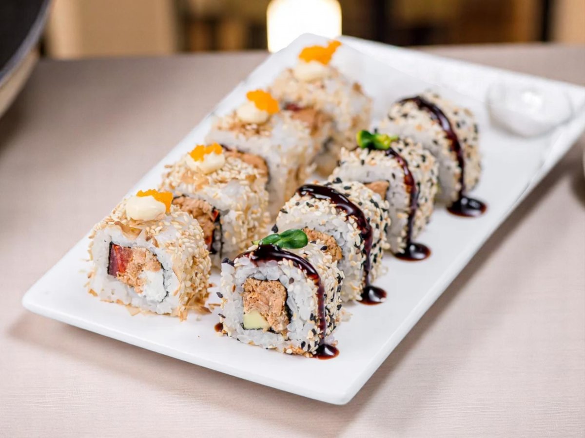 8 броя, риба тон, ориз, нори, сьомга, сос от манго, бадемови люспи 180г