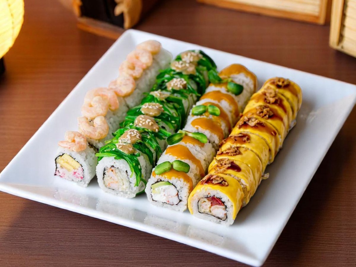 40 броя рол Калифорния 8 броя, Калифония със скарида 8 броя, Калифония със сьомга 8 броя, Калифония с пиле 8 броя, Калифорния с пържена сьомга 8 броя 1000г