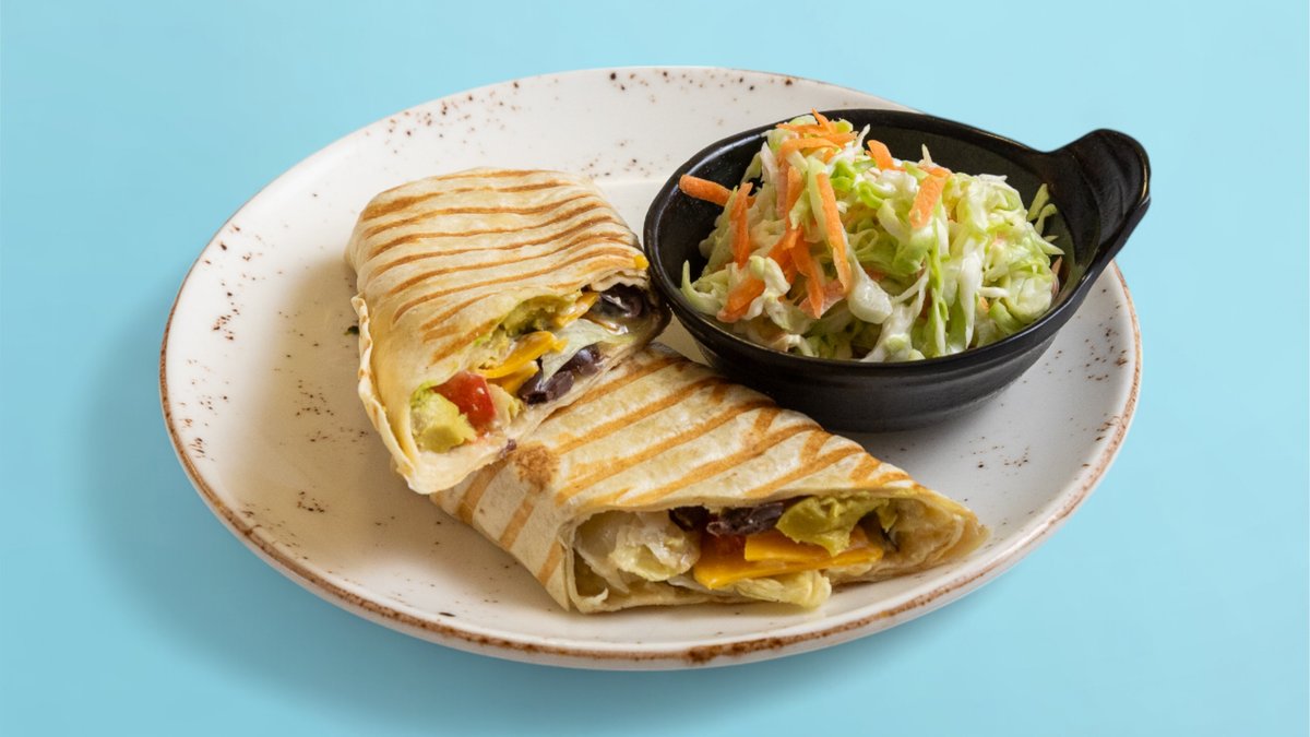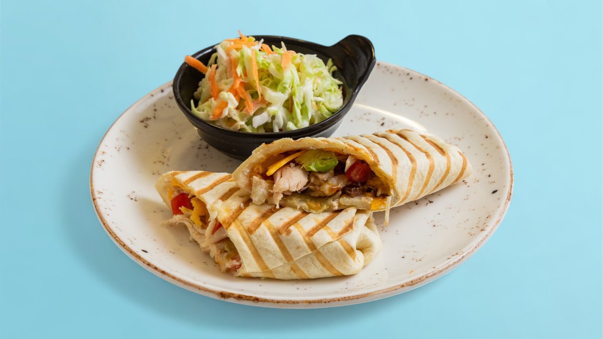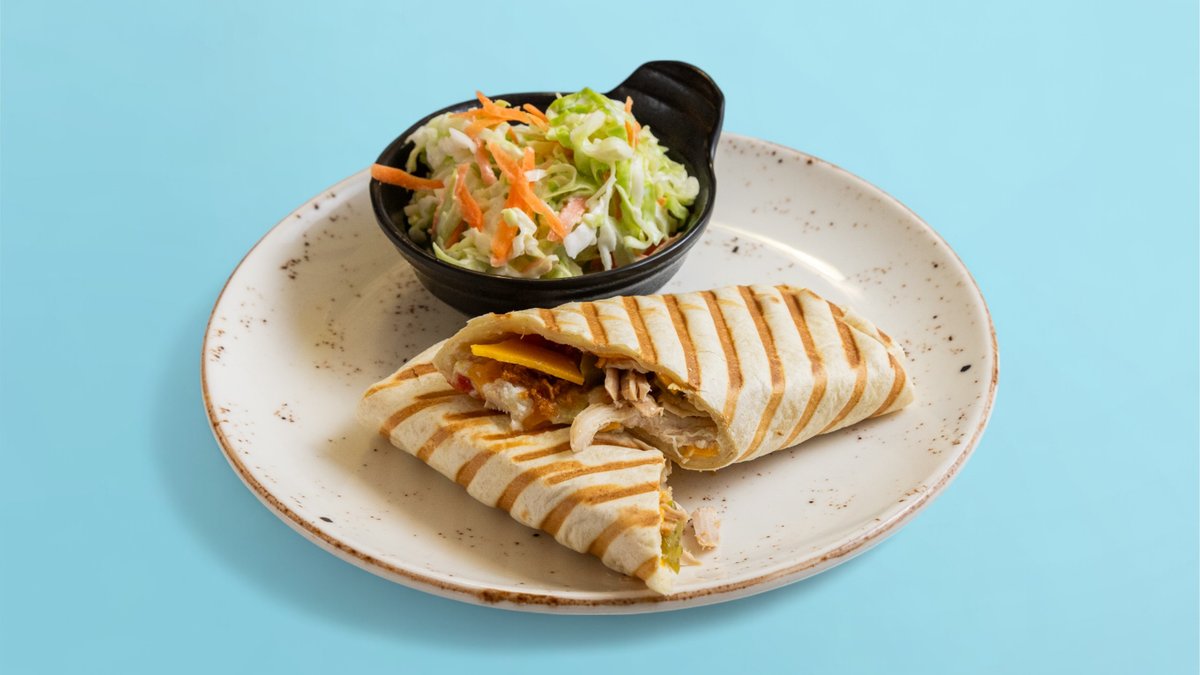 тортила-питка, филаделфия, айсберг, дърпано пилешко месо су-вид, домат, микс гауда + чедър, гуакамоле, хрупкав чипс, млечен сос и гарнитура салата Косло 100г