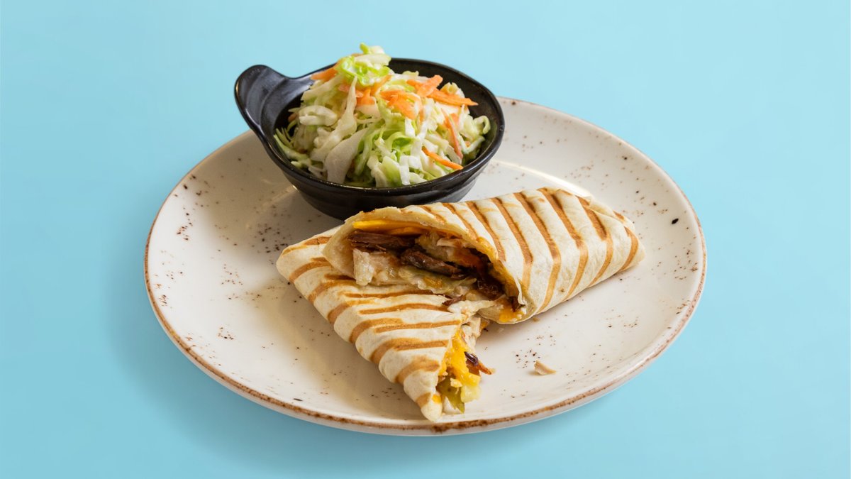 тортила-питка, филаделфия, айсберг, дърпано свинско месо су-вид, домат, микс гауда + чедър, кисели краставички, хрупкав чипс, млечен сос и гарнитура салата Косло 100г
