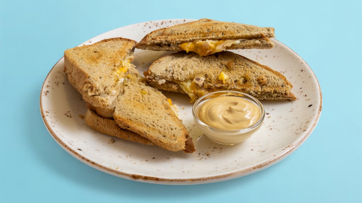 тостерни филии бял или пълнозърнест хляб 4бр, билково масло, дърпано пилешко месо су-вид, гауда, сос