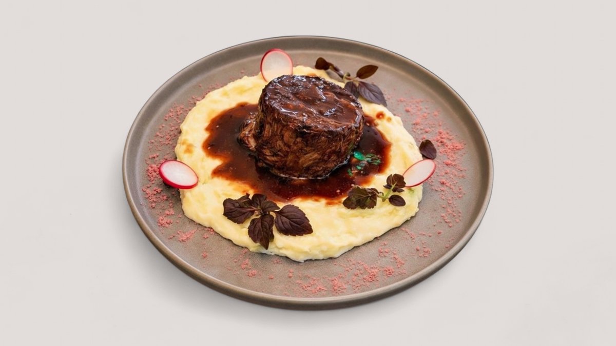 Су-Вид крехко дърпано телешко, поднесено с картофено пюре и печен сос 400г