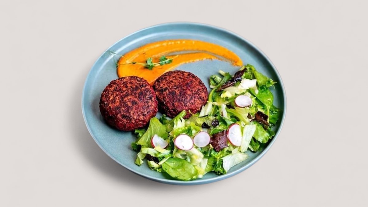 Кюфтета от червена леща със свежа салата и сос от печени зеленчуци