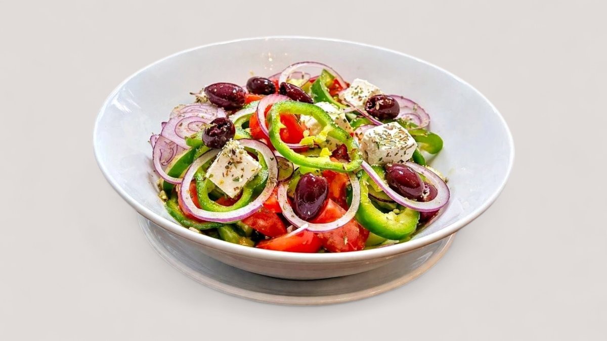 Домати, краставици, червен лук, зелена чушка, маслини ,мариновано фета сирене и риган 350 гр
