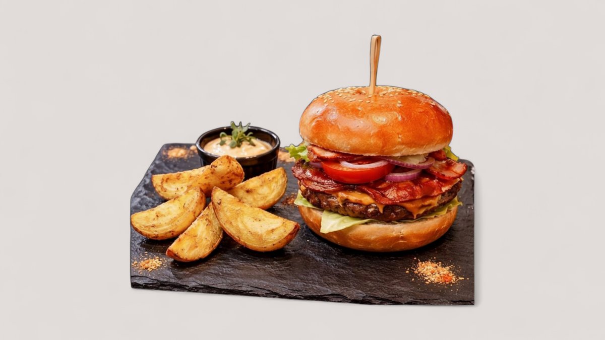 бриош питка, телешки бургер, сос Чедър, домат, айсберг, кисели краставички, бекон , печени картофи и bbq-mayo сос 450г