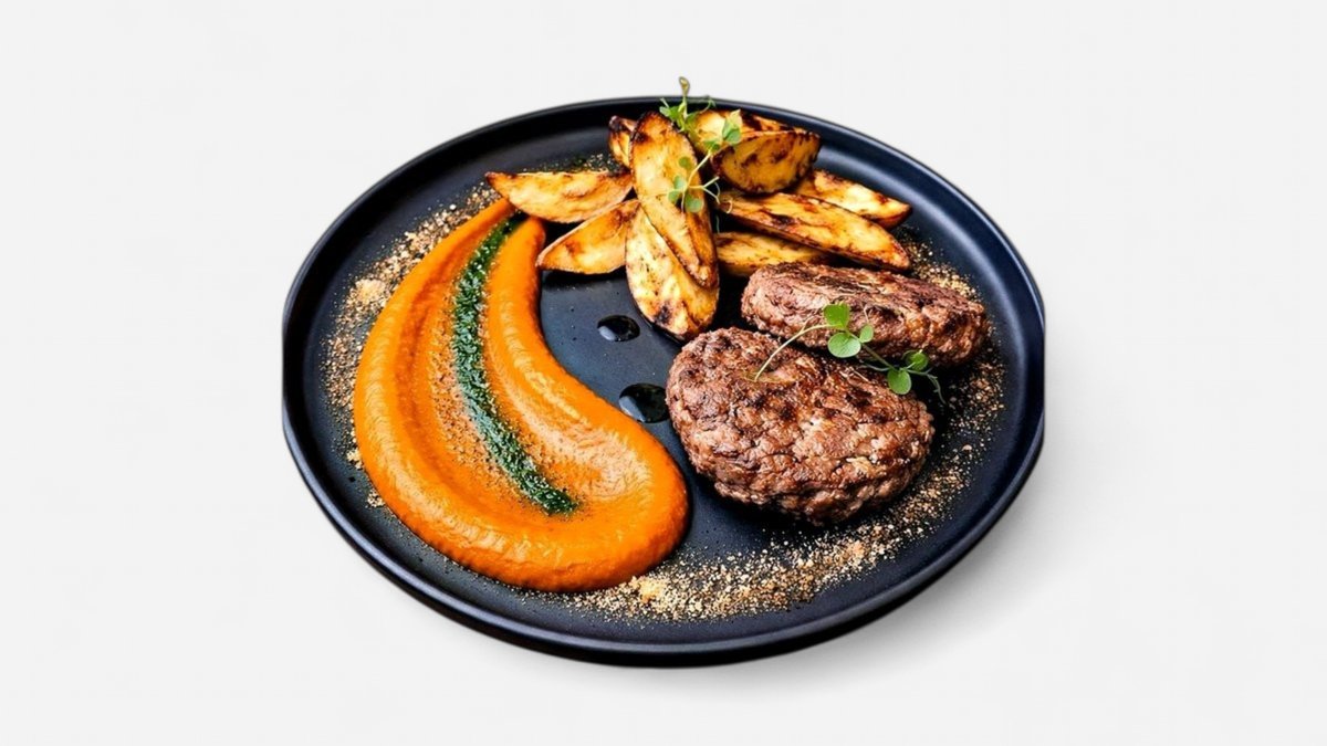 Телешки кюфтета с печени картофи и фин сос Ромеско