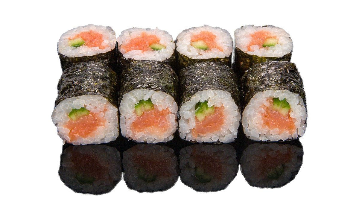 сварен ориз, пушена сьомга, краставица, нори 110г, 8 броя