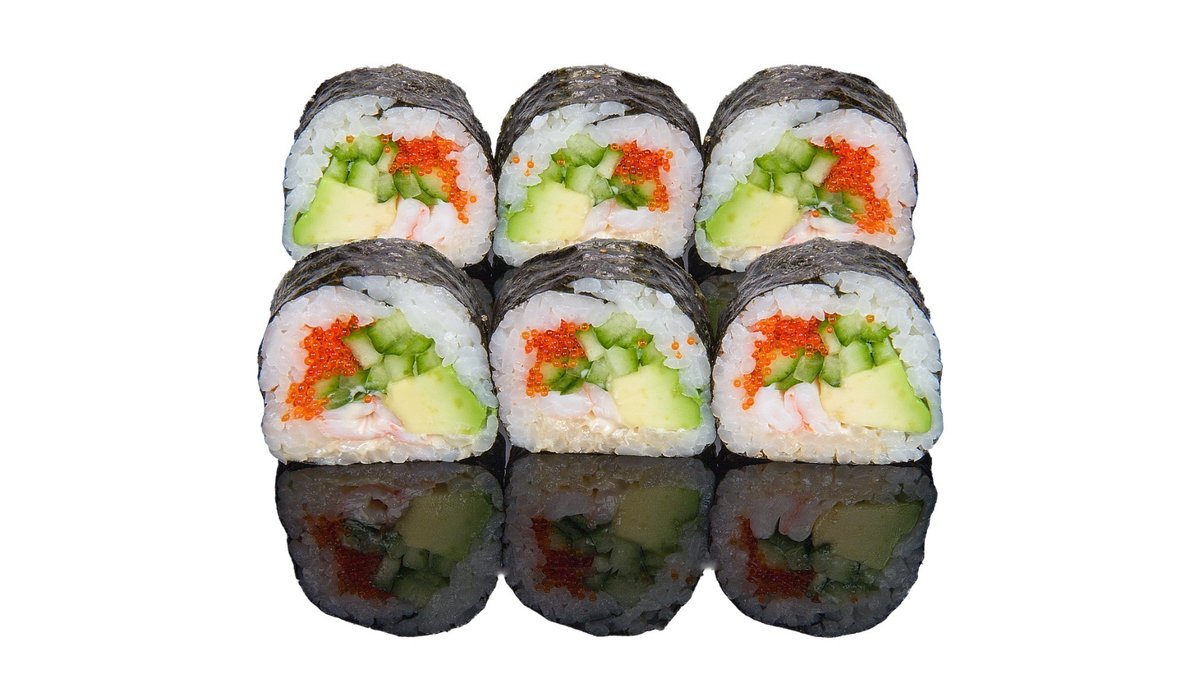 сварен ориз, скарида, авокадо, краставица, нори, тобико, майонеза 165г, 6 броя