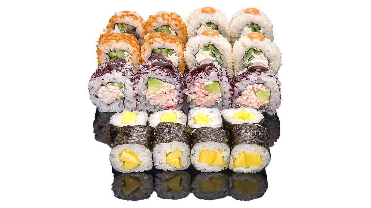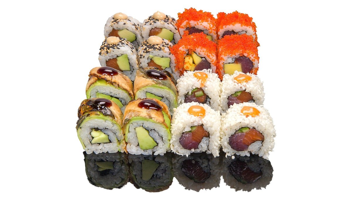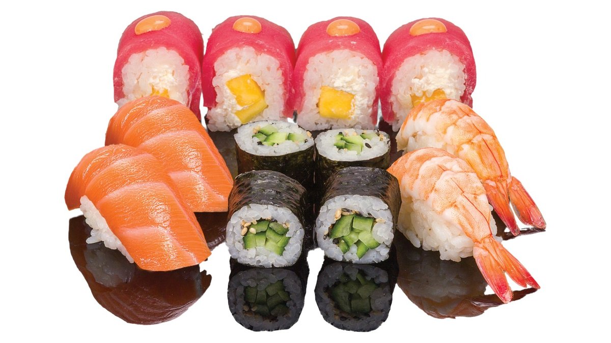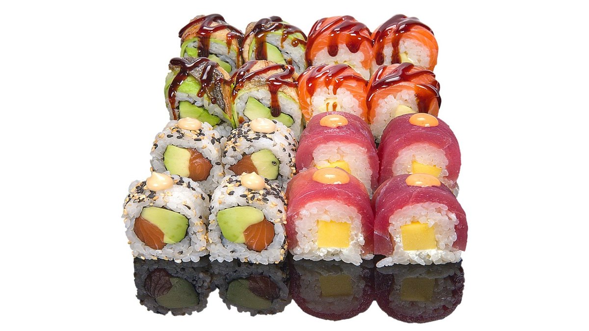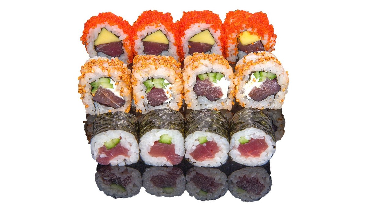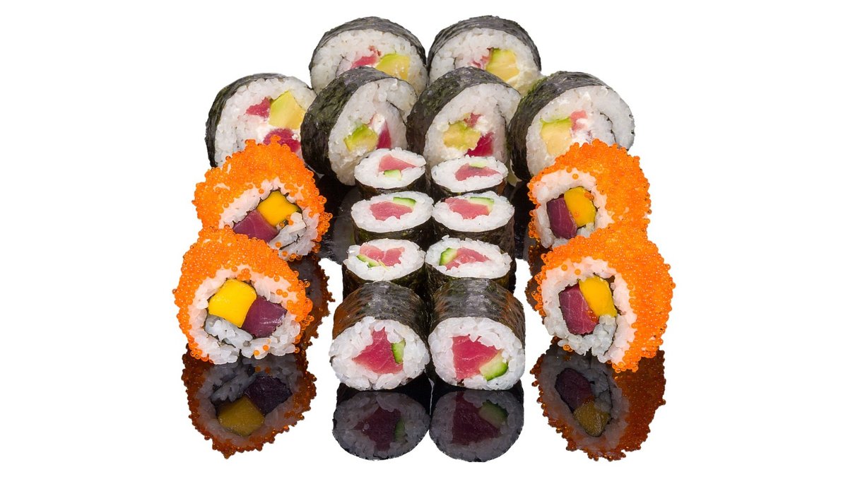 сварен ориз, тон, нори, скарида, Филаделфия, краставица, авокадо, манго, спайси майонеза, панко трохи, кимчи сусам, смес краб, унаги сос, юкари 410г, 20 броя
