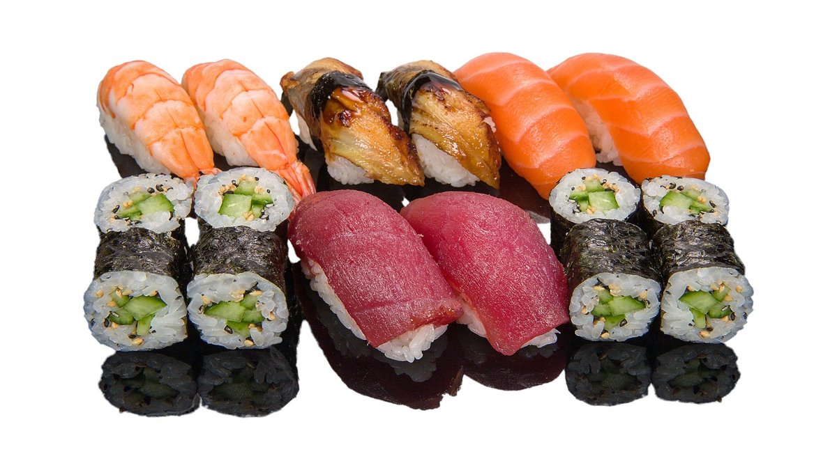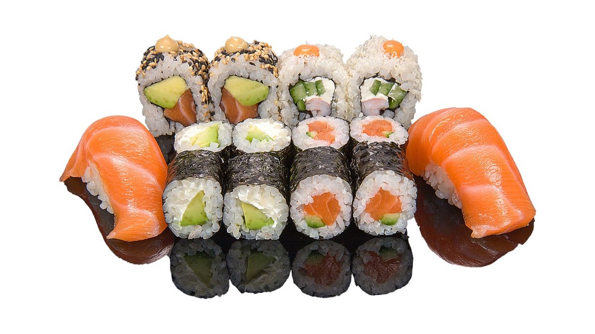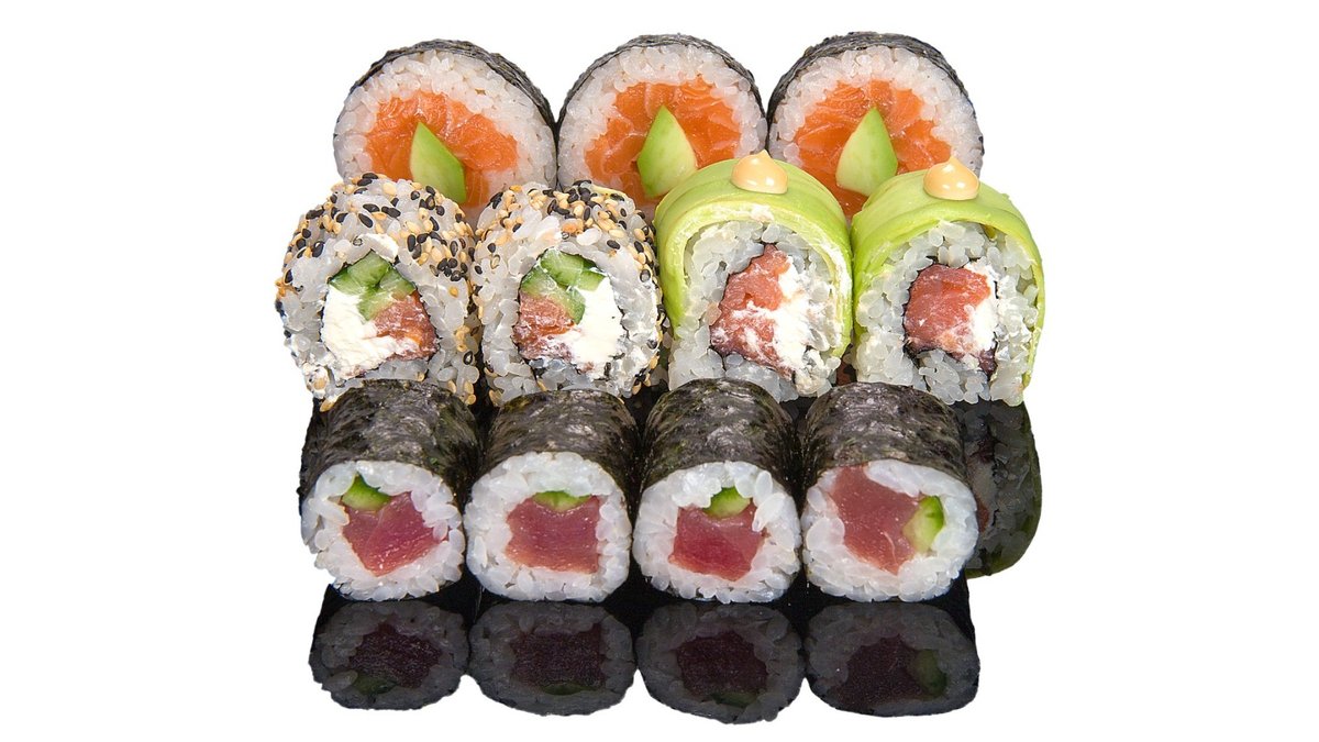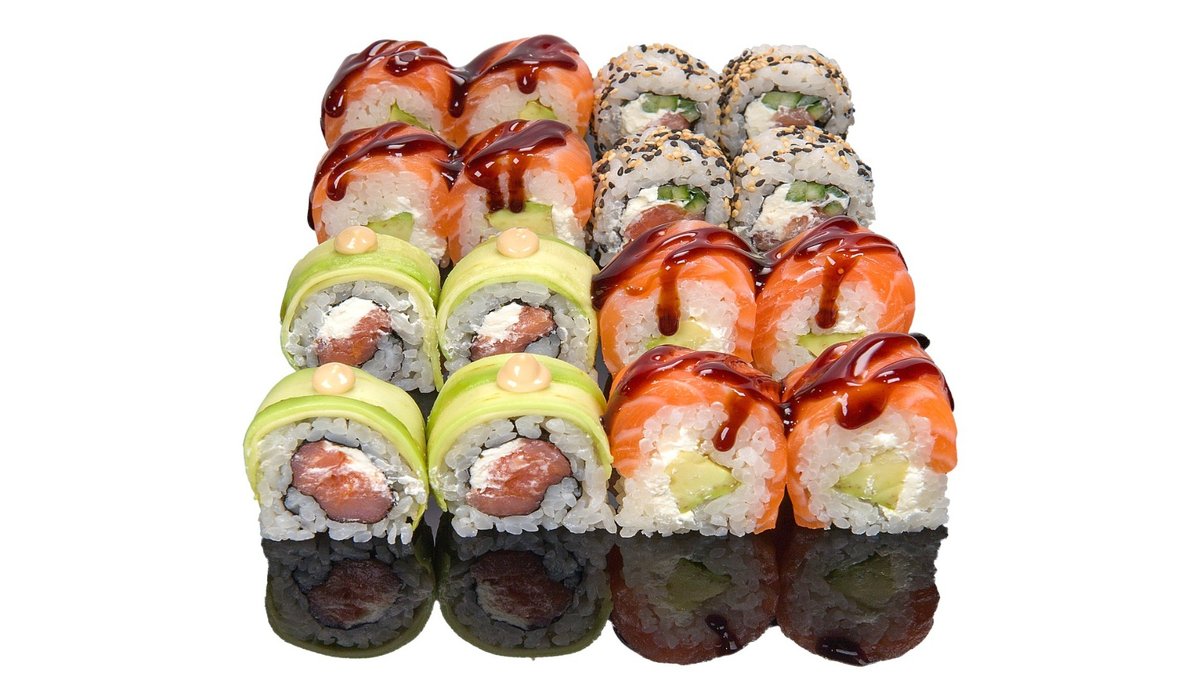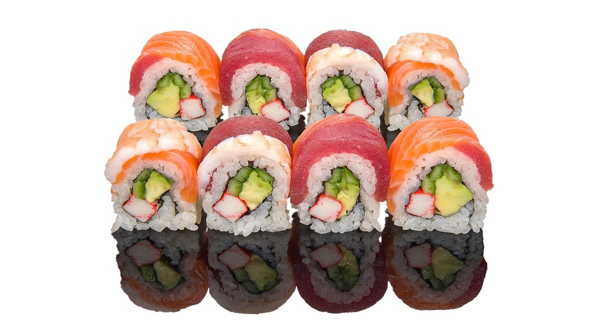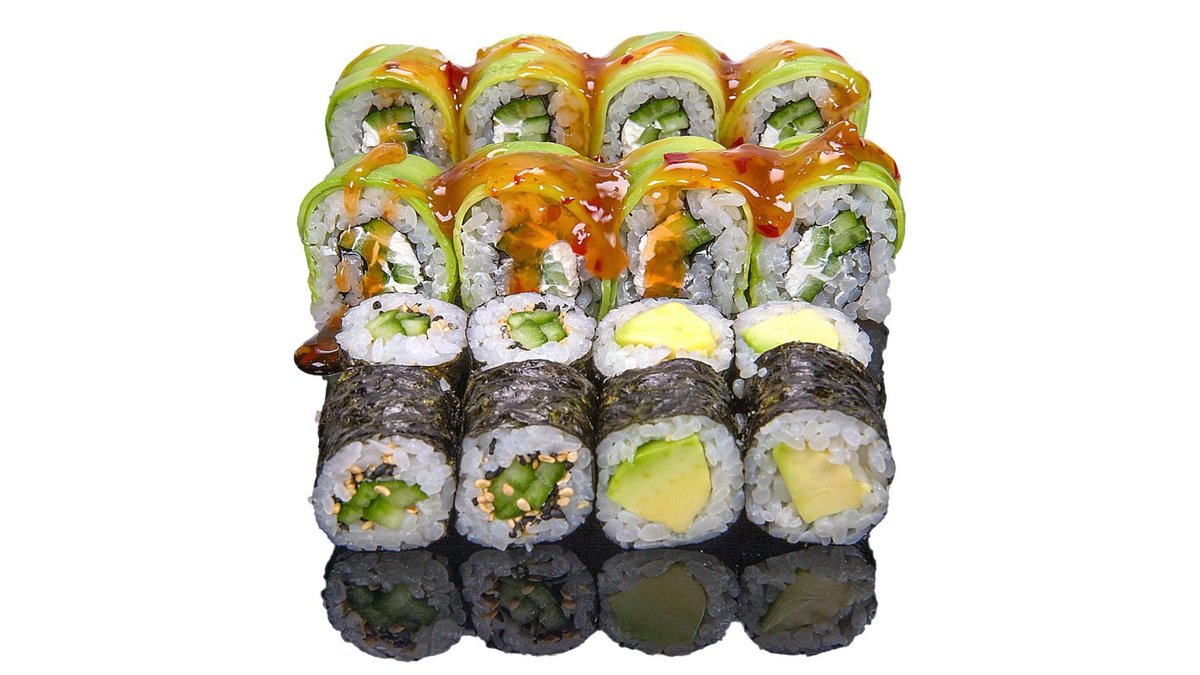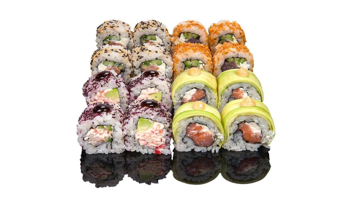 сварен ориз, тон, нори, скарида, Филаделфия, краставица, авокадо, манго, спайси майонеза, панко трохи, кимчи сусам, смес краб, унаги сос, юкари 410г, 20 броя