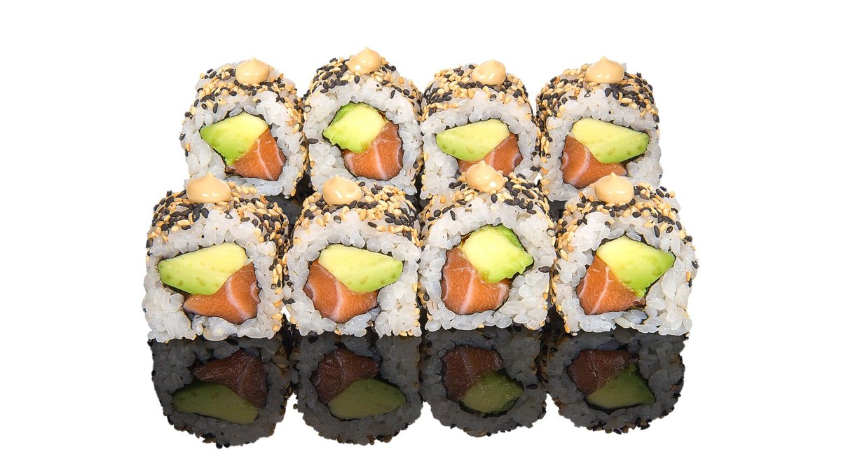 сварен ориз, авокадо, краставица, майонеза, морска сол, нори, смес краб, сьомга, унаги сос, юкари 340г, 16 броя