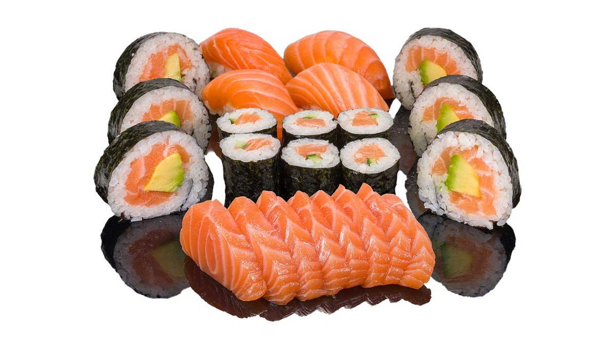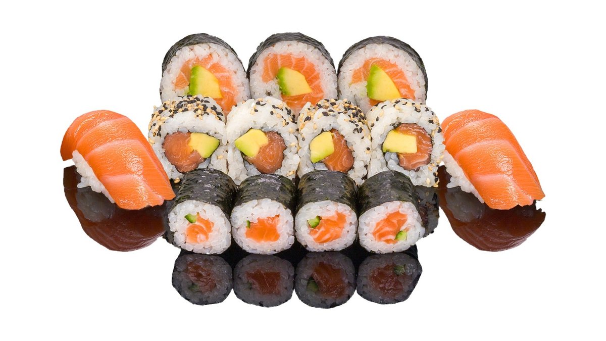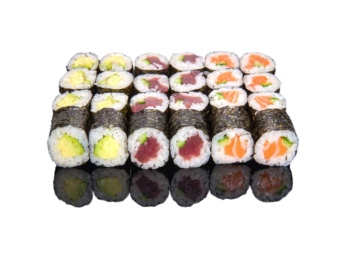 сварен ориз, сьомга, тон, нори, краставица, авокадо 330г, 24 броя