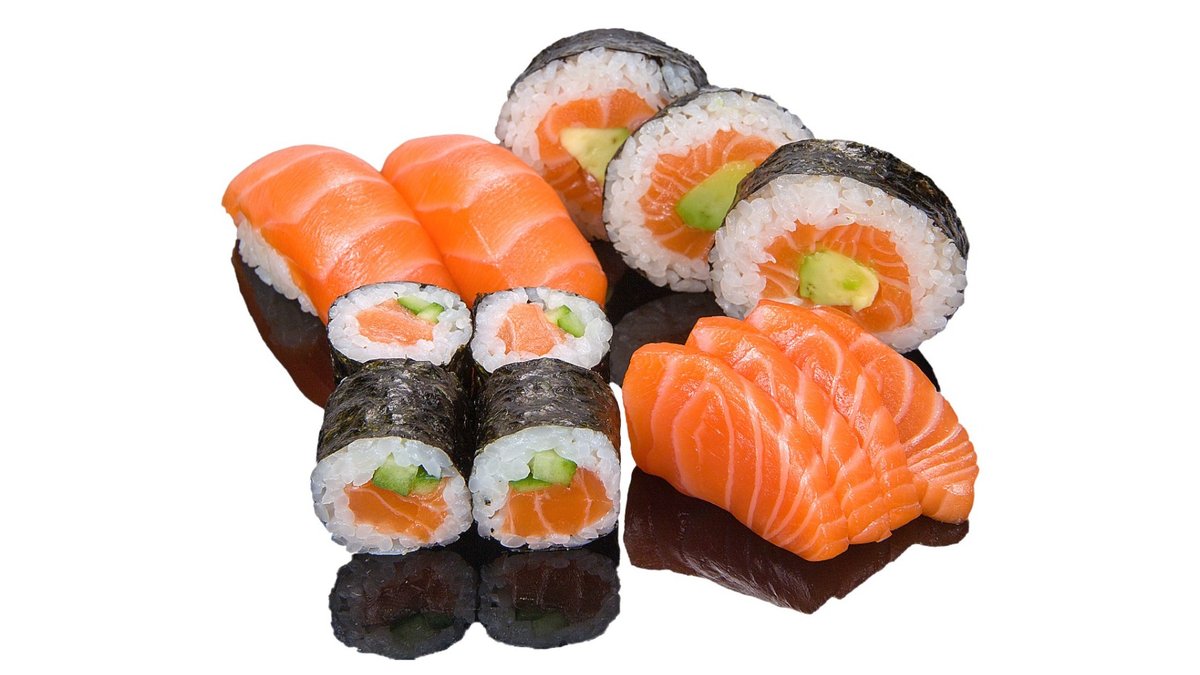 сварен ориз, сьомга, смес краб, майонеза, унаги сос, нори, морска сол 270г, 8 броя