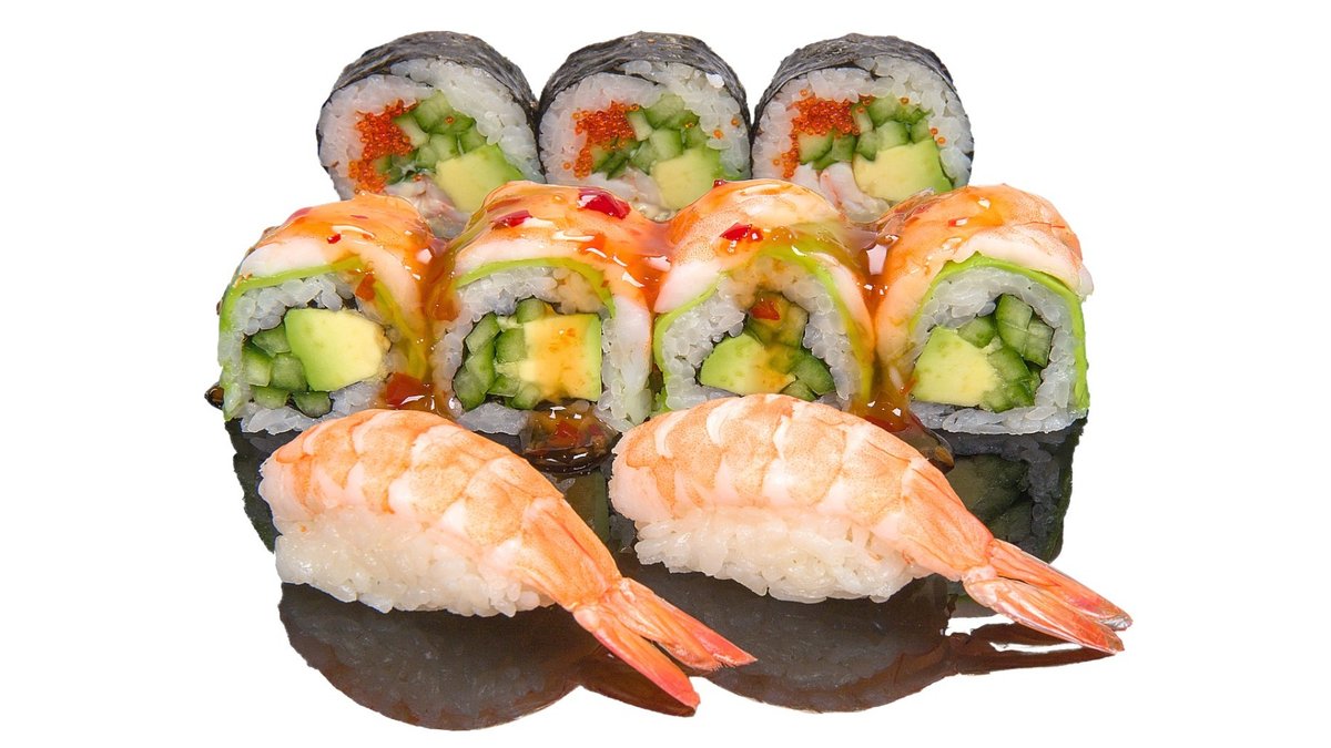 сварен ориз, скарида, авокадо, нори, краставица, сос дракон, тобико, майонеза 260г, 9 броя