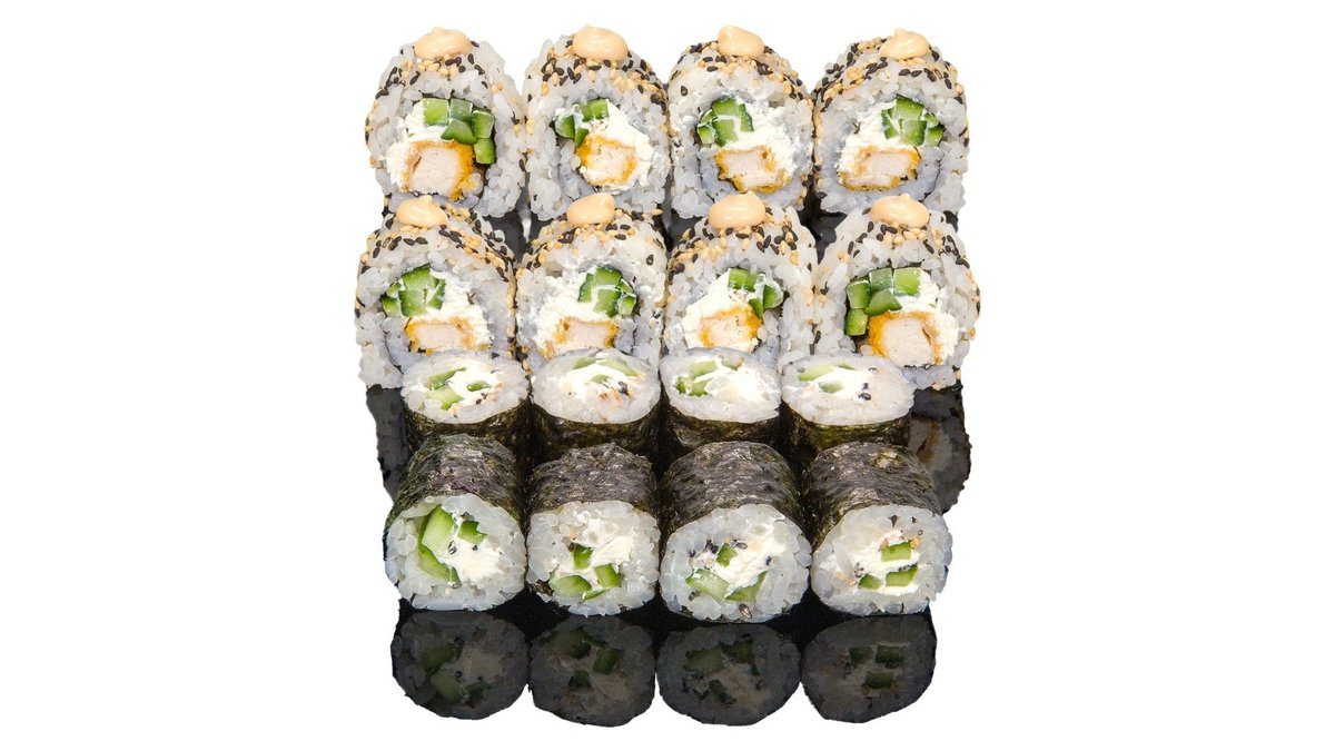 сварен ориз, пиле, Филаделфия, краставица, нори, сусам, майонеза 320г, 16 броя