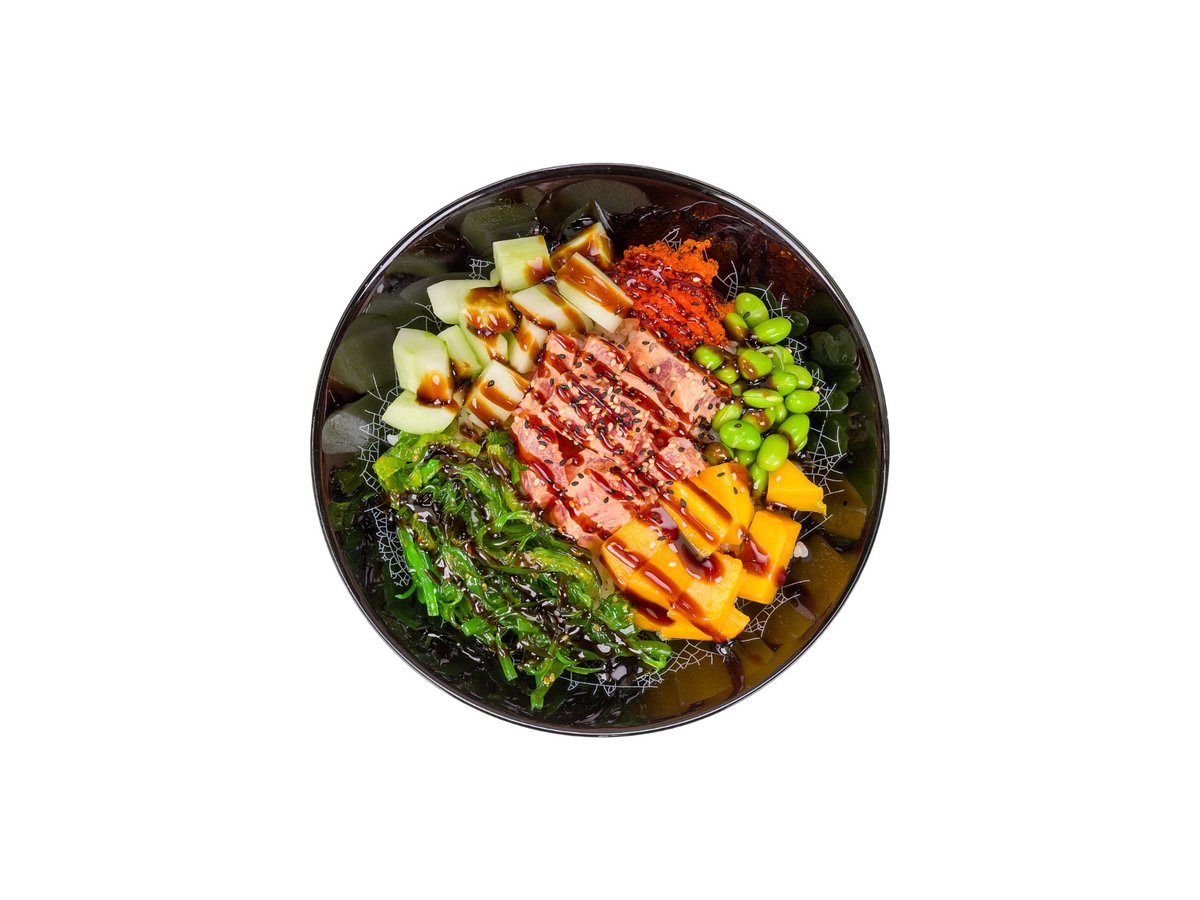 сварен ориз, майонеза, тон, спайси майонеза, уакаме, едамаме, манго, краставици, тобико, унаги сос, сусам 360г