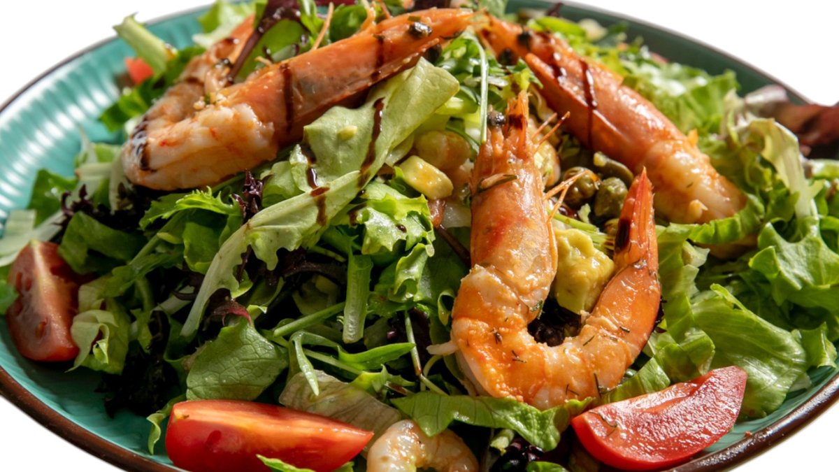 Кралски скариди, крутони, Пармезан, салати микс, чери домати, сос Цезар, мини скариди 400г
