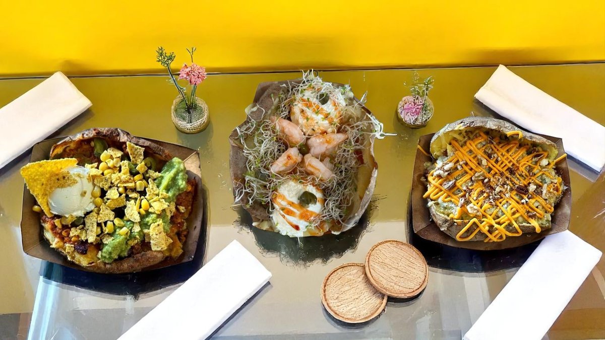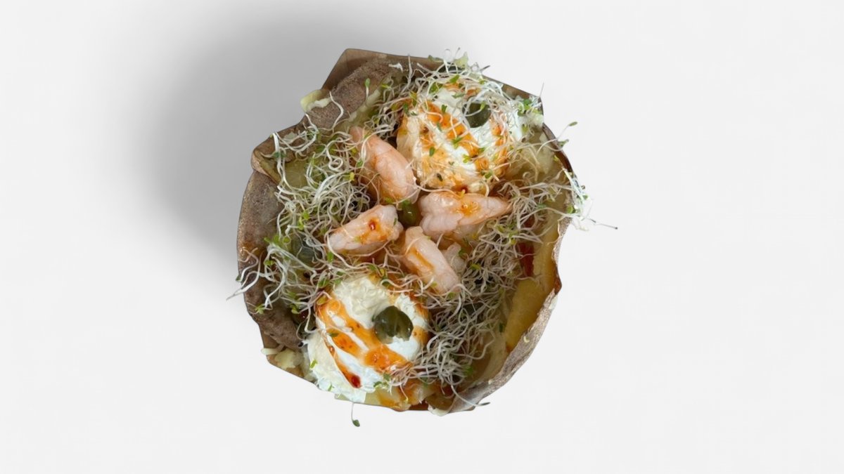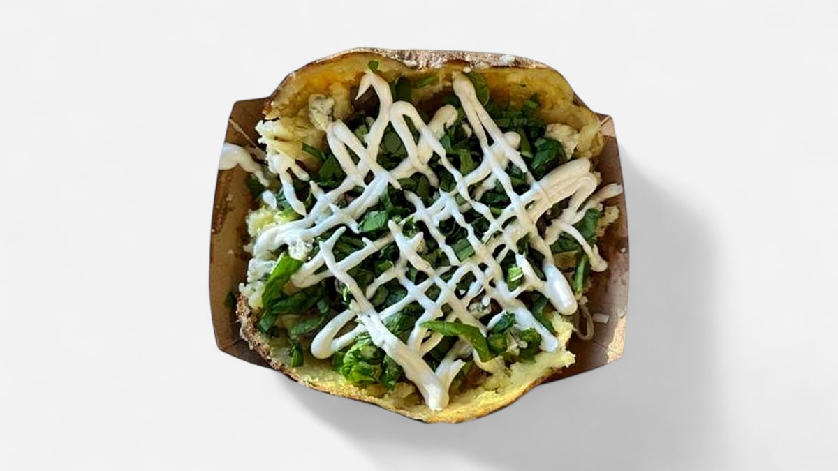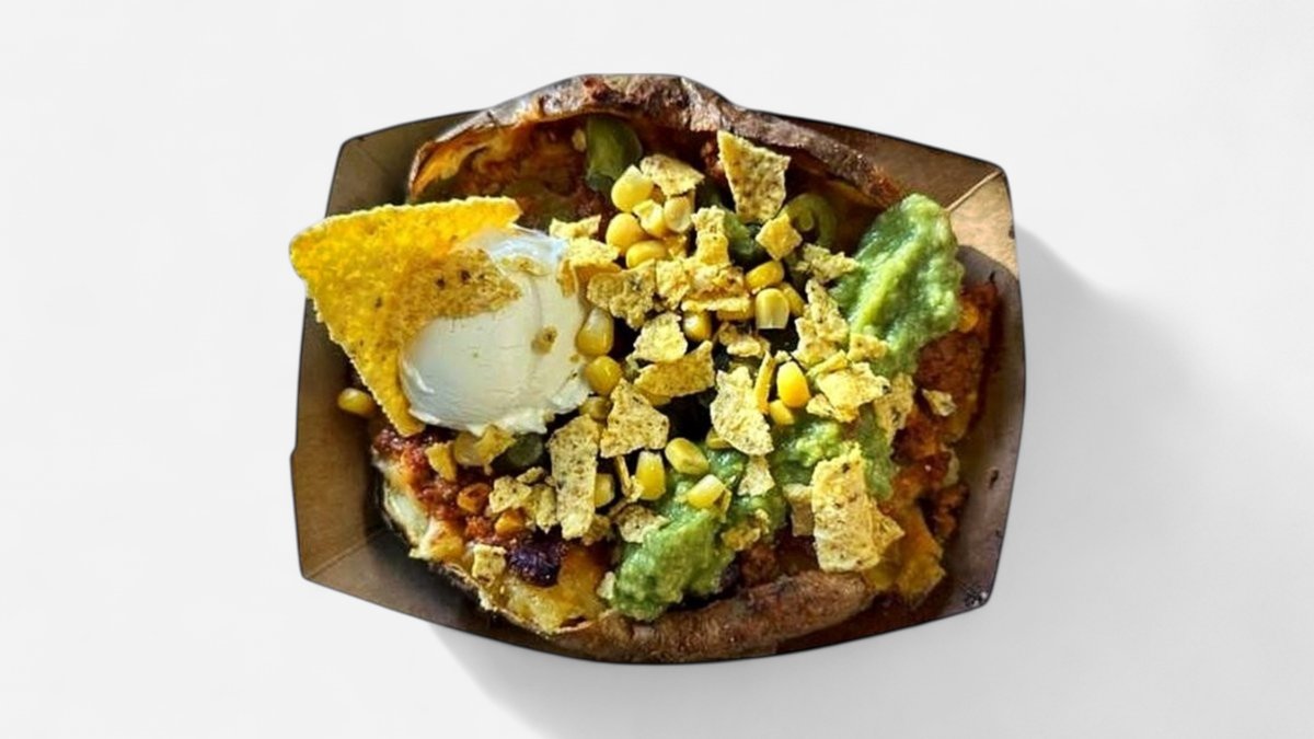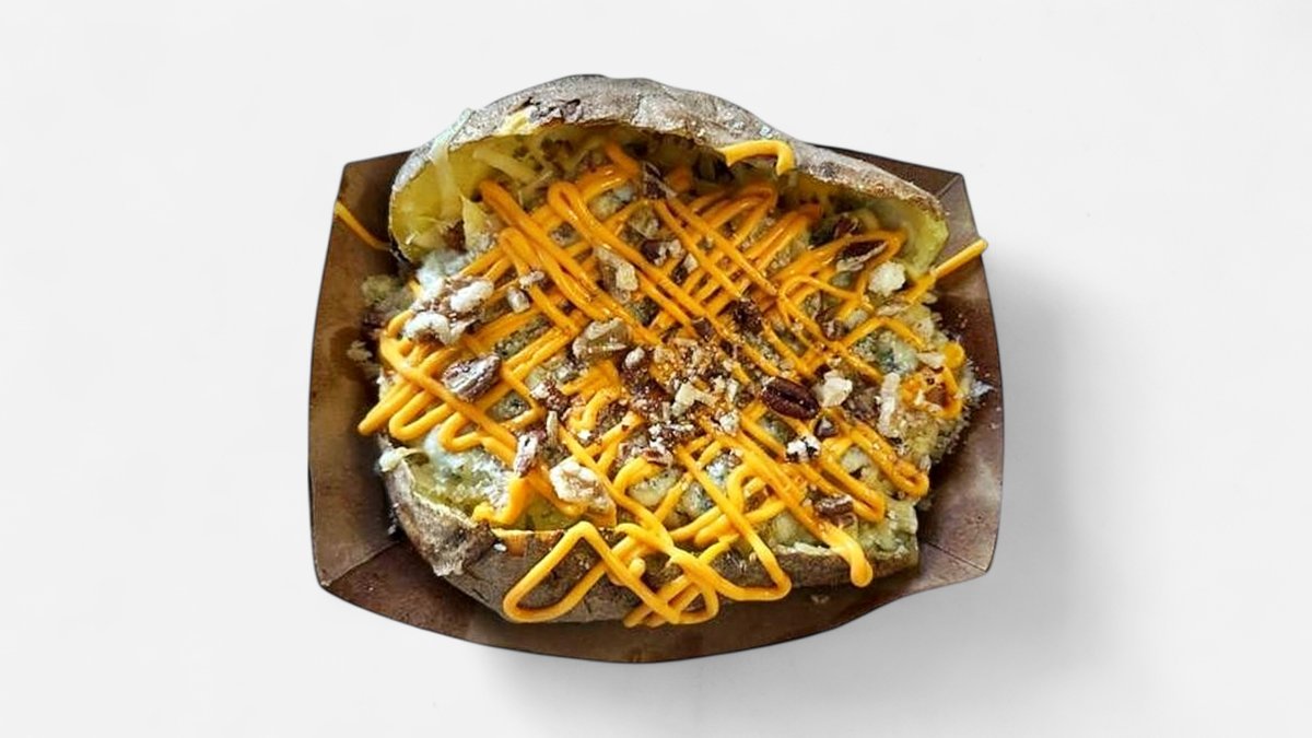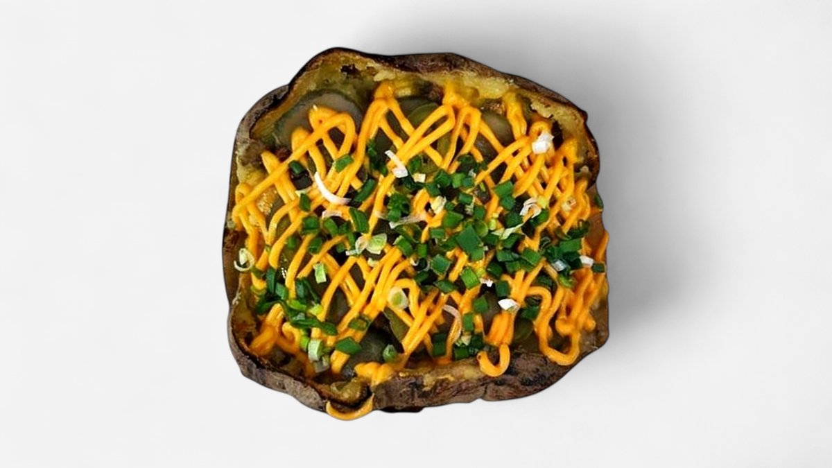 печен картоф с масло, моцарела, дърпано свинко месо и барбекю сос, гарнирани с халапеньо, кисели краставички и сос чедър