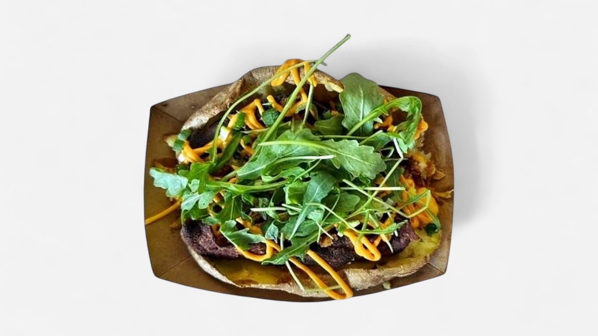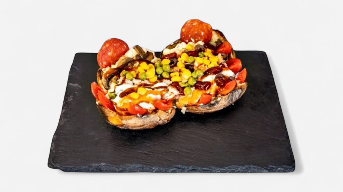 краве масло, хрупкав бекон, зрял ирландски чедър, пържен лук, чушки халапеньо, чедър сос, пресен лук и рукола, 650г