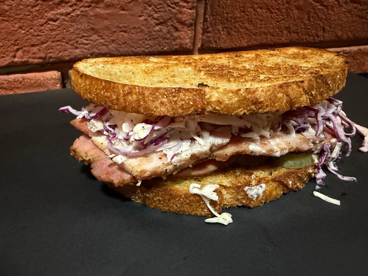 Домашен ръжен хляб запечен с масло,горчичен сос, кисела краставичка, Колсло и 150гр слайсове свинско контрафиле, мариновано 2 седмици и опушено на дървени въглища и ябълково дърво
