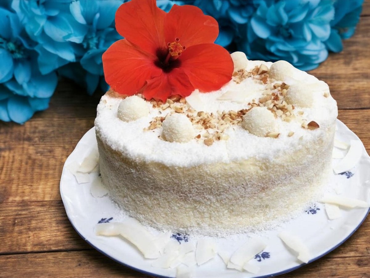 бадемови платки, нежен крем от бял шоколад, сметана, кондензирано мляко и кокосови стърготини