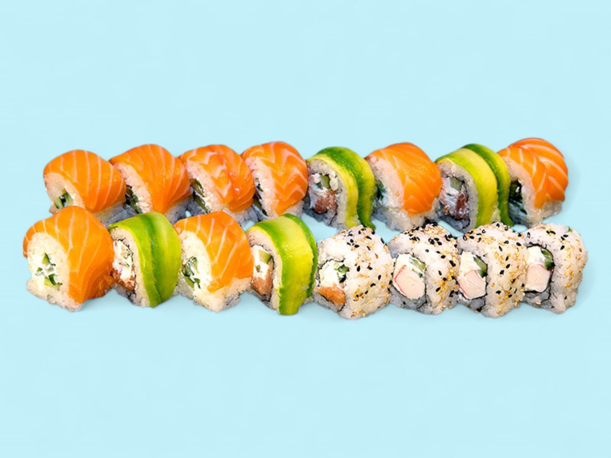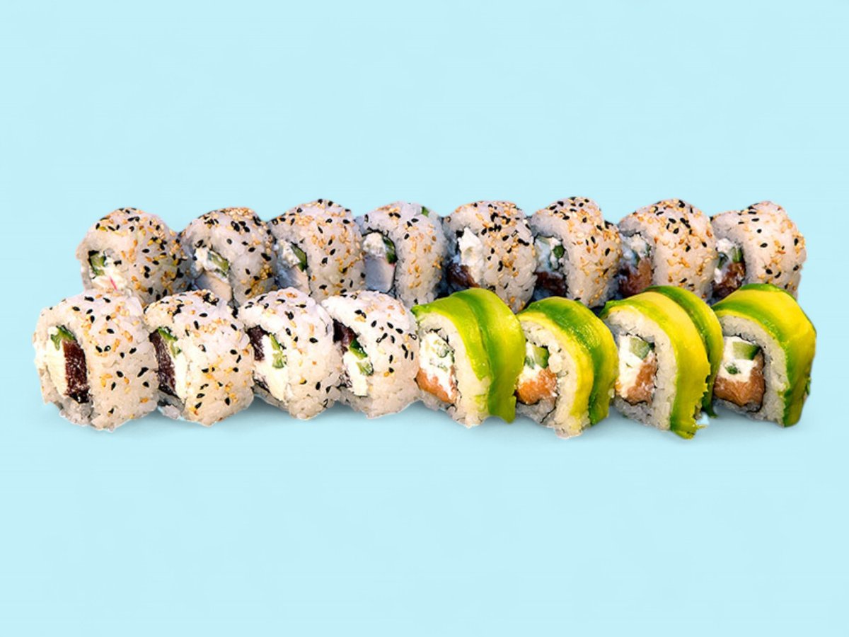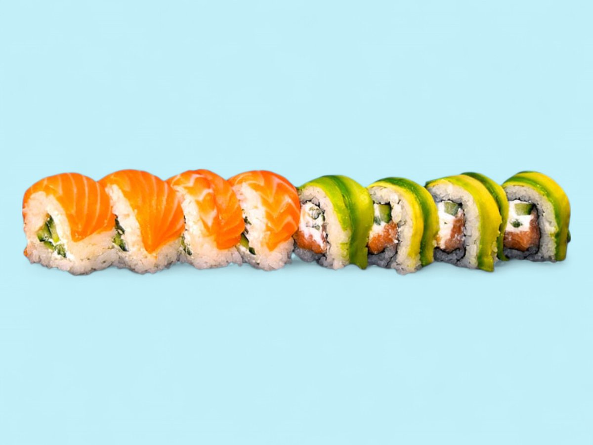 760г, този сет събира на едно място пушена сьомга и прясна риба тон заедно с мекия вкус на филаделфия, полезните свойства на авокадото и приятните рачешки рулца, обвити в суши ориз, някои от които поръсени с пълнозърнесто сусамче. прясна сьомга, покриваща рулце суши ориз с крема сиренце и свежа краставичка.