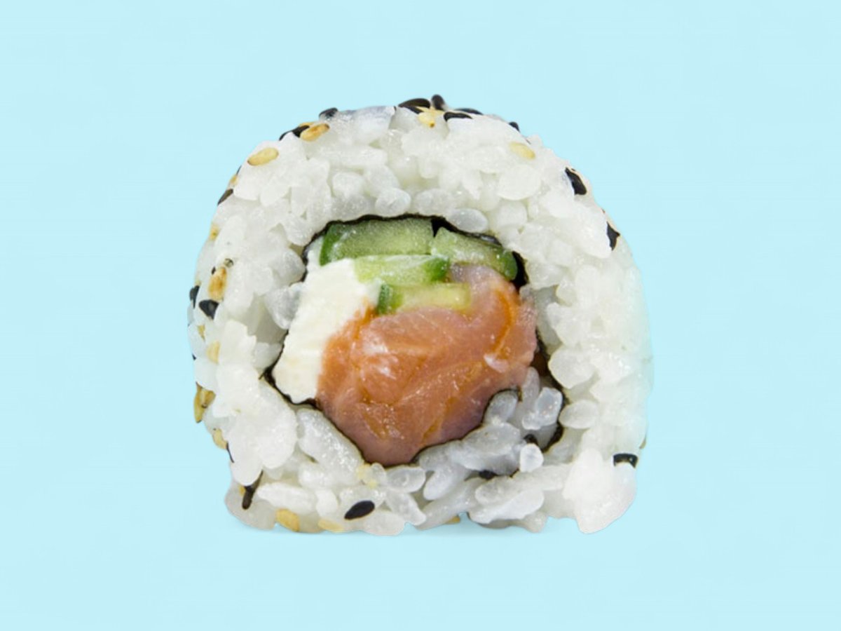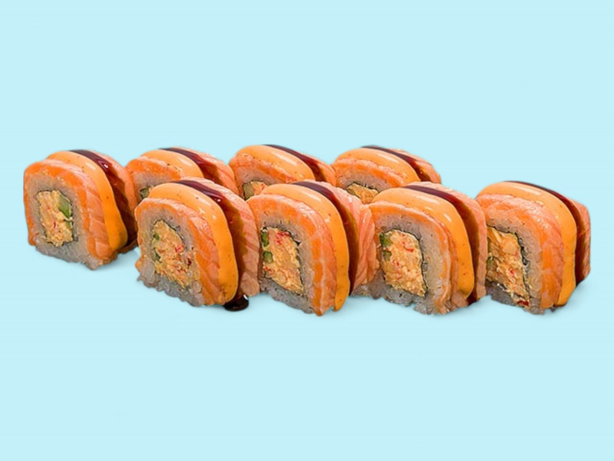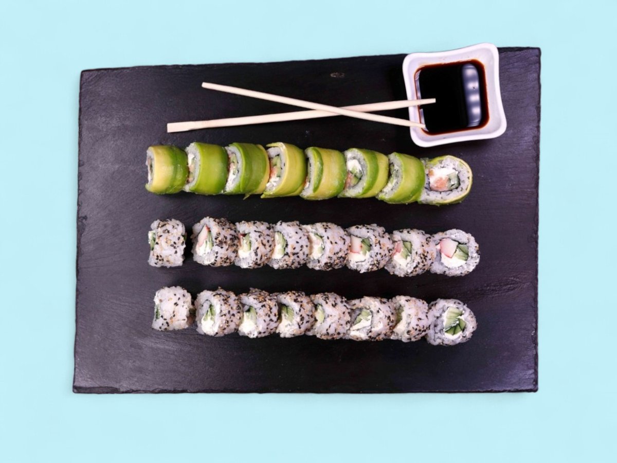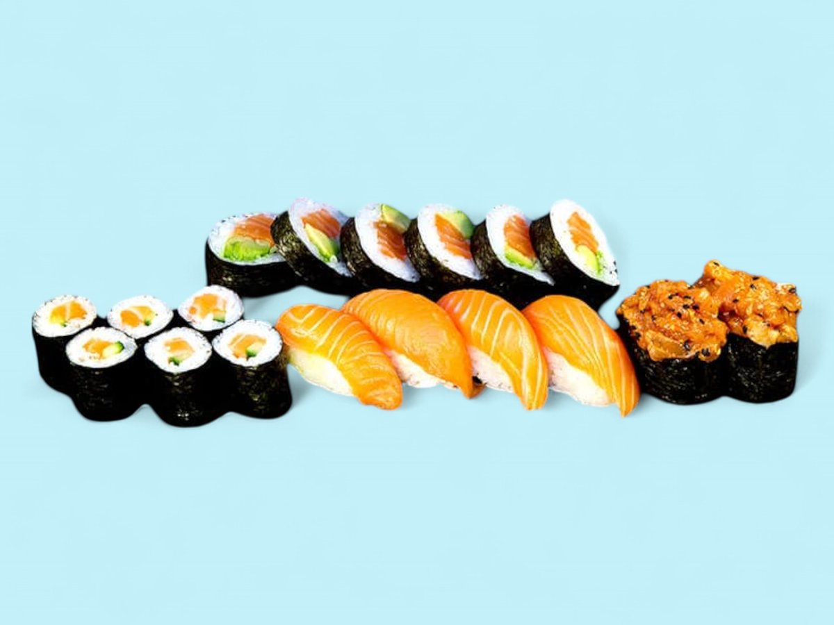 760г, този сет събира на едно място пушена сьомга и прясна риба тон заедно с мекия вкус на филаделфия, полезните свойства на авокадото и приятните рачешки рулца, обвити в суши ориз, някои от които поръсени с пълнозърнесто сусамче. прясна сьомга, покриваща рулце суши ориз с крема сиренце и свежа краставичка.