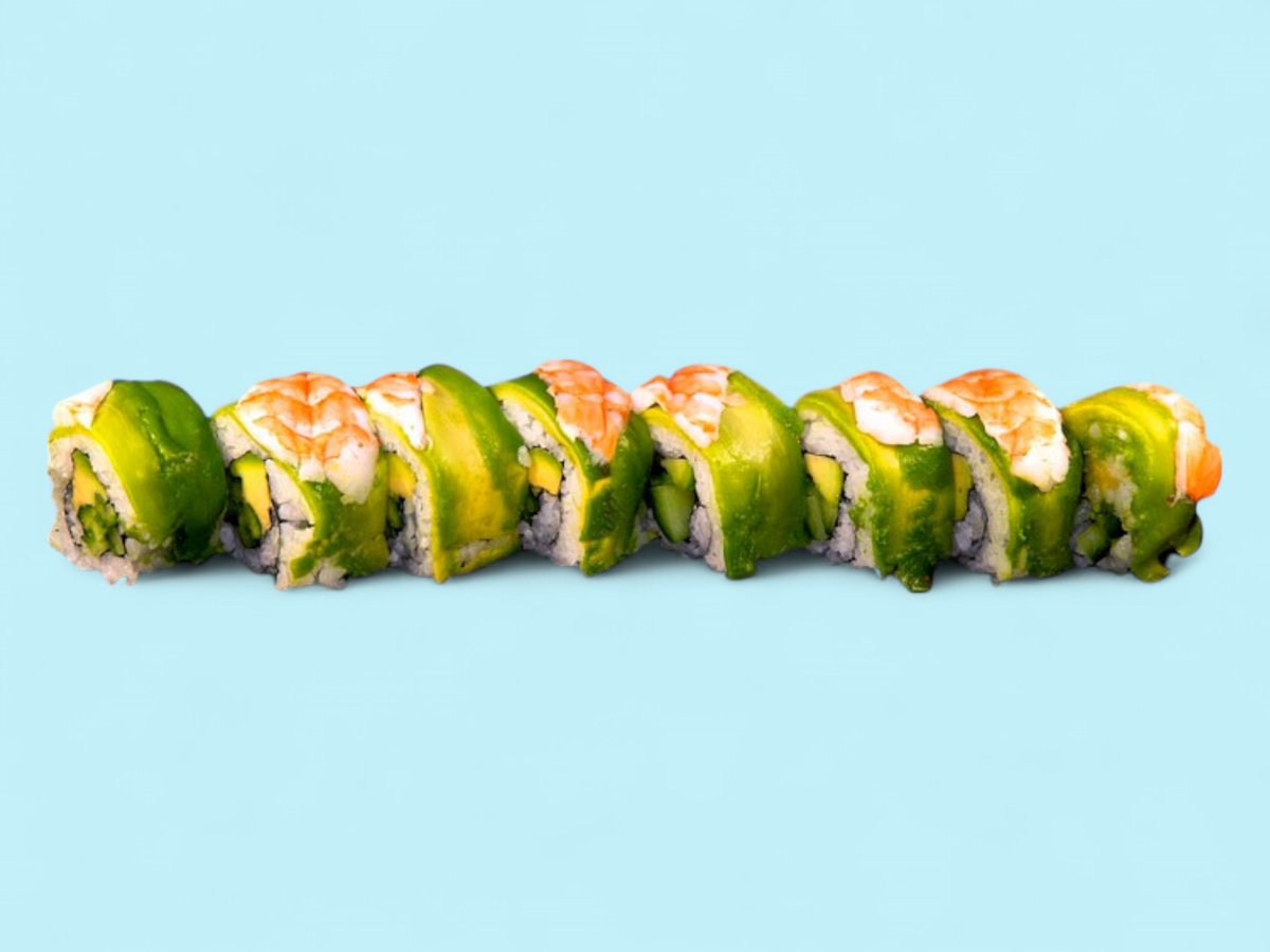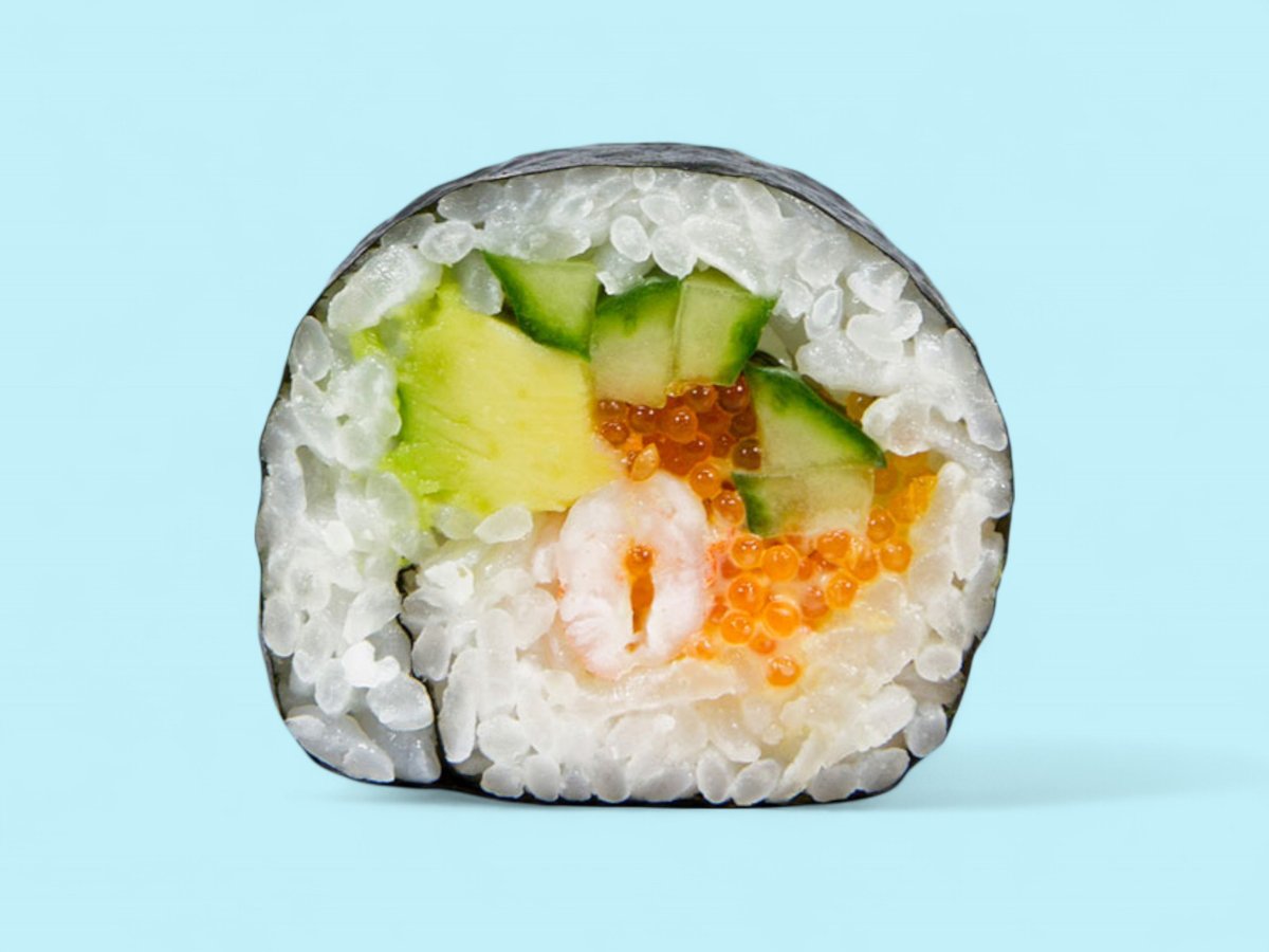 микс от бланширана скаридка, соева майонезка, свежо авокадо, хрупкава краставичка и топчета хайвер тобико, 6бр, 170г