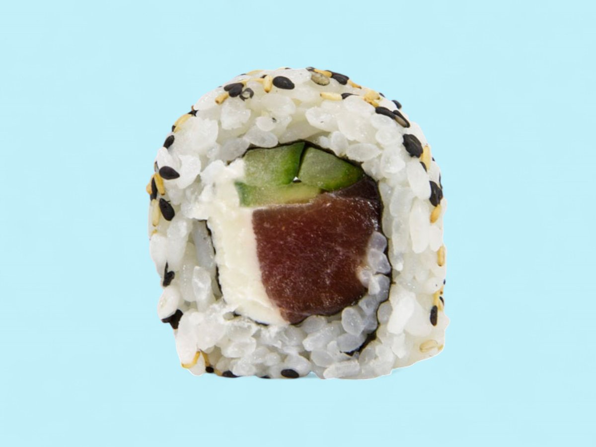 прясна риба тон с крема сиренце и свежа краставичка, обвити в суши ориз и поръсени с пълнозърнесто сусамче, 4бр, 120г