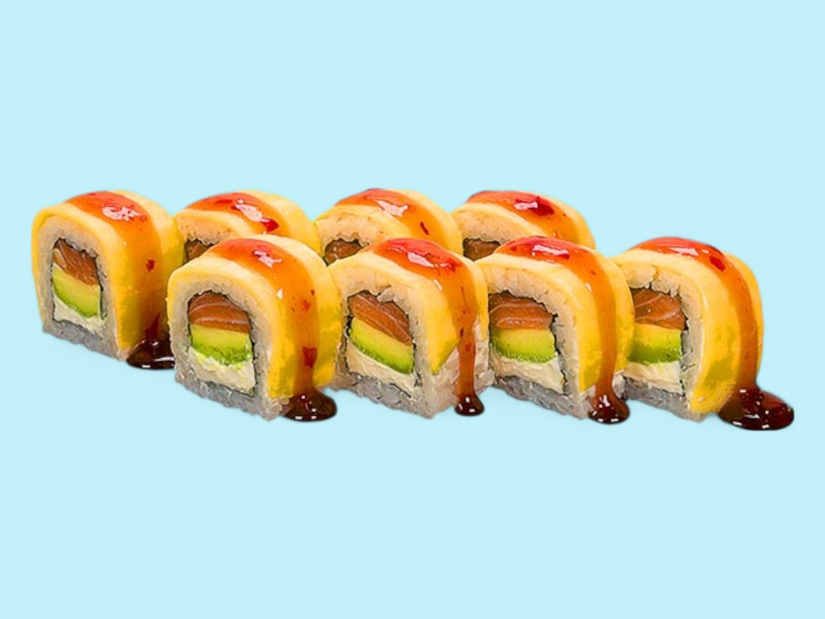 ориз, крема сирене, нори, авокадо, манго, сьомга. 8 броя