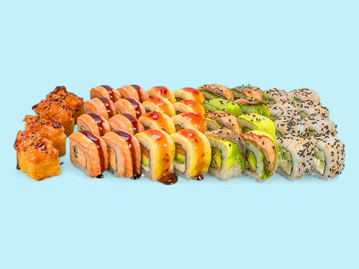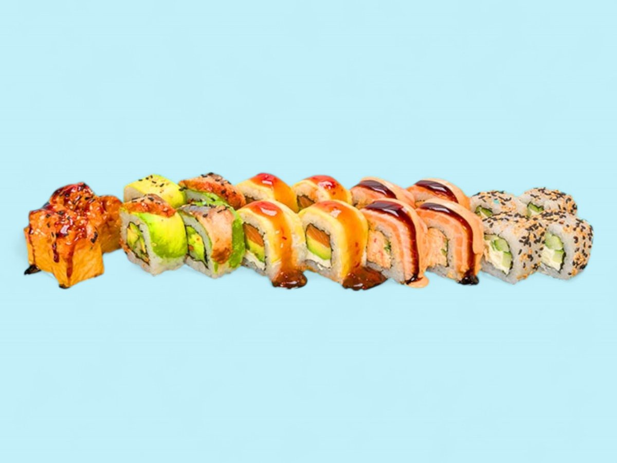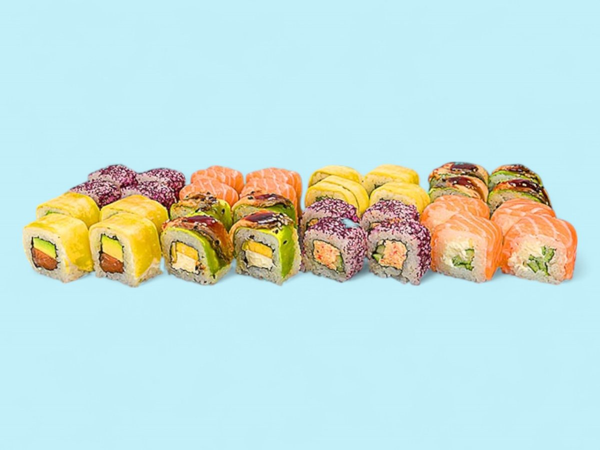 1550г, взривяваща сетивата комбинация от нашите най-пъстри предложения като Яма рол, Дъга, Саке рол татаки, Филаделфия сурими, Филаделфия тон, Хосо тон, Хосо краставичка и хосо сьомга.