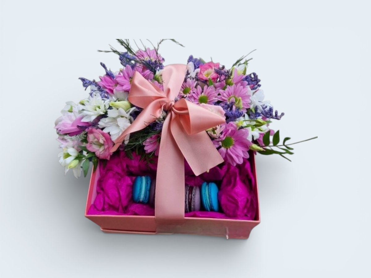Кутия с цветя и френски макарони