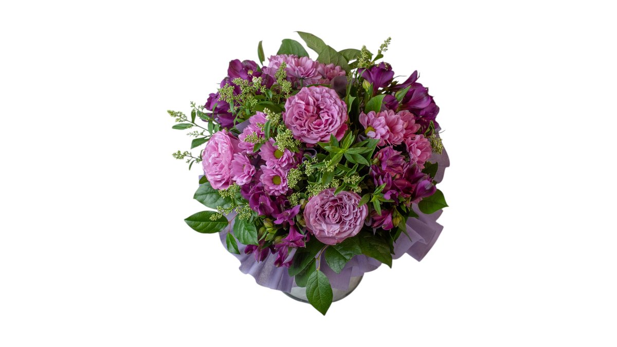 Букет алстромерия и хризантеми розово-червен микс с опаковка