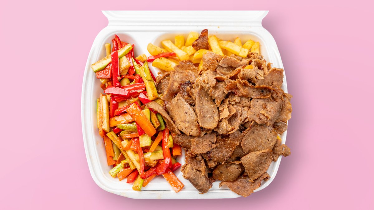 телешко, месо, пържени картофи, 2 вида зеле, домати, айсберг, сос краставици, печен лук и специален