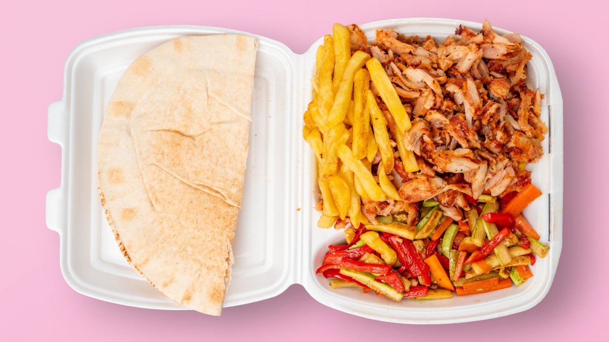 питка лаваш, пилешко, месо, пресни пържени картофи, 2 вида зеле, домати, айсберг, краставици, печен лук и специален сос