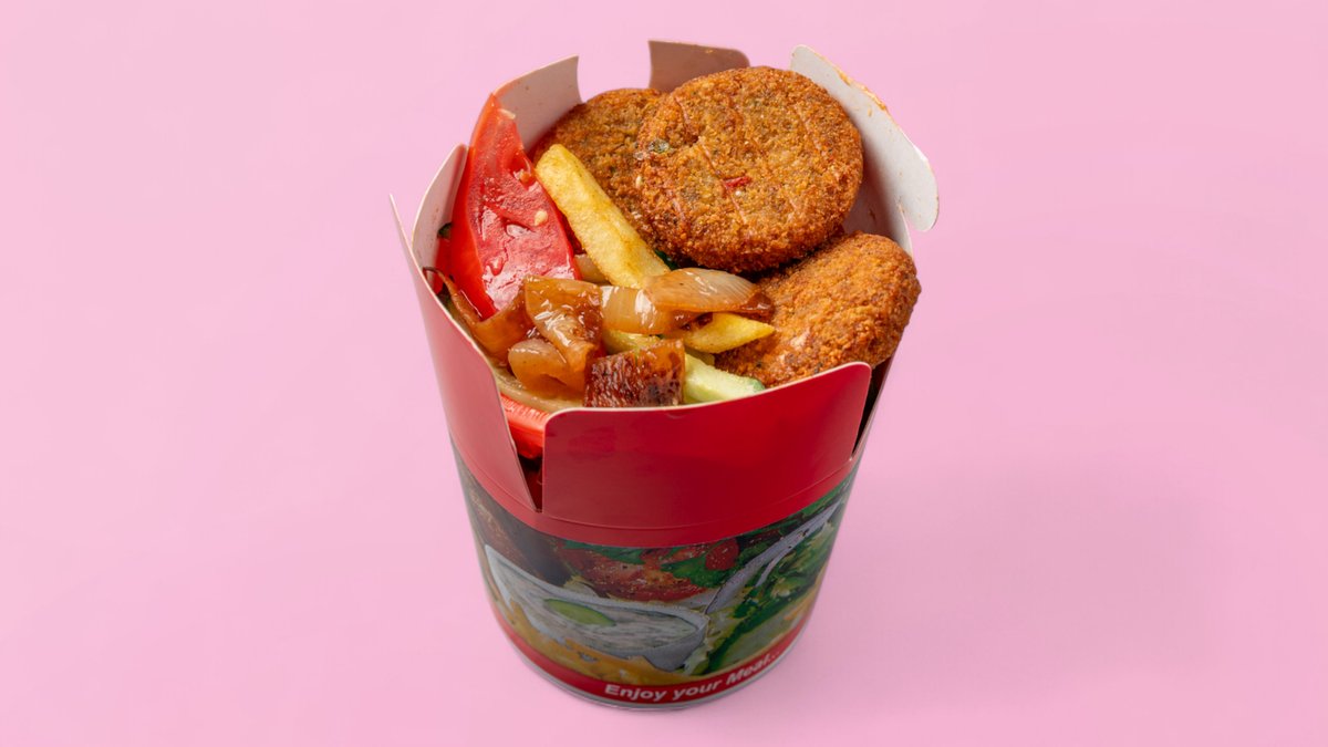 фалафел, пържени картофи, 2 вида зеле, домати, айсберг, краставици, печен лук и специален сос